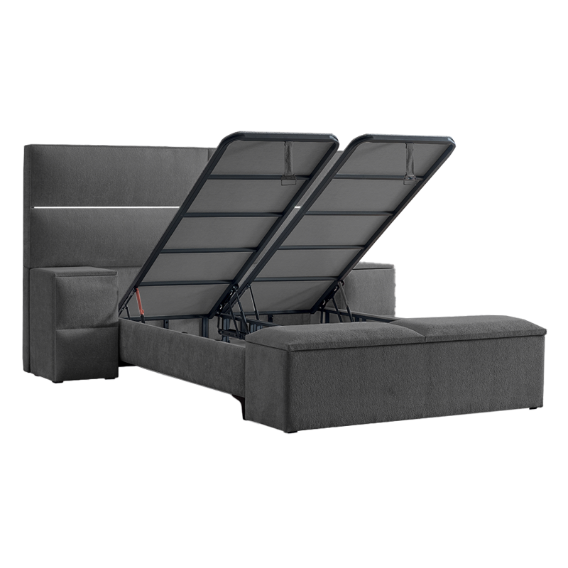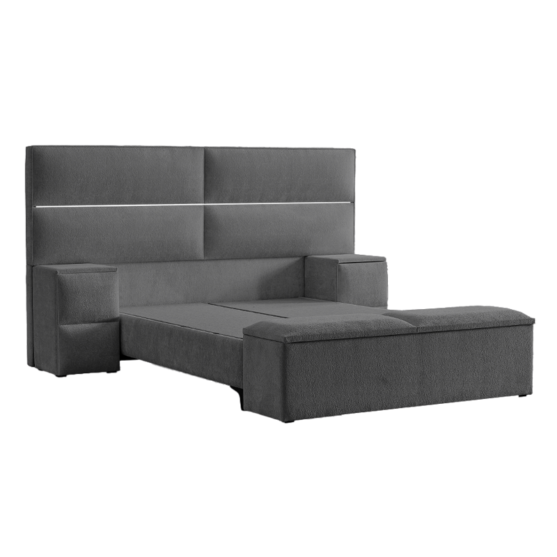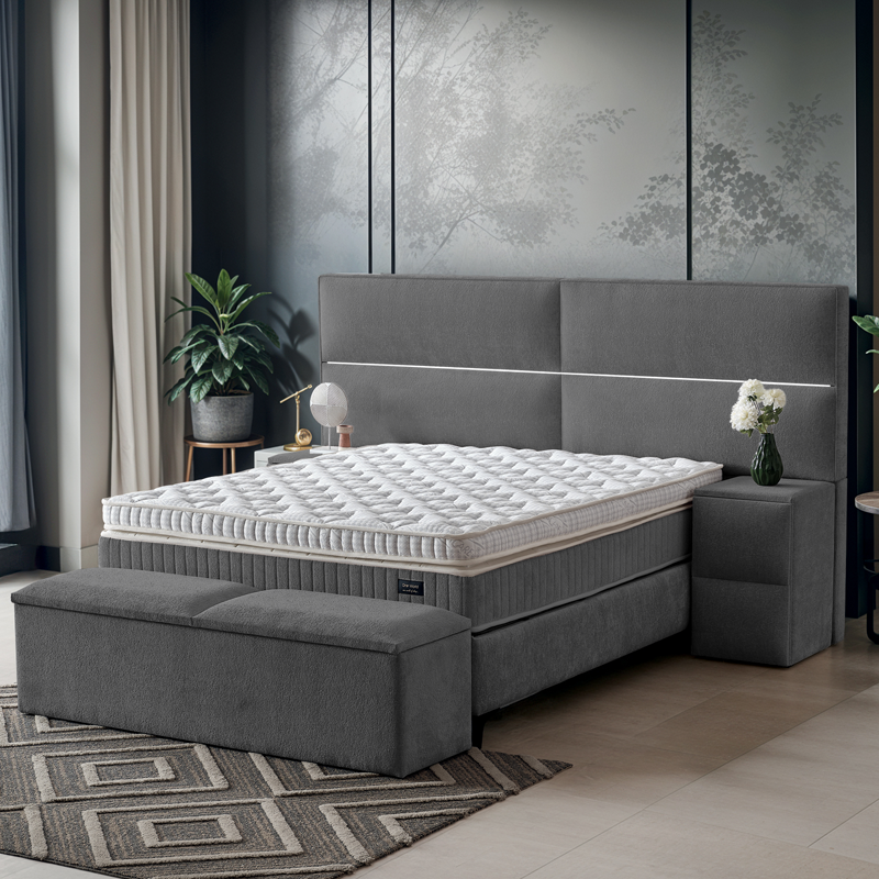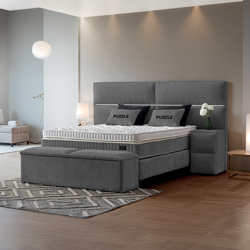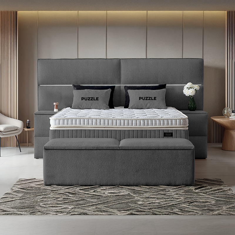 Тапицирана спалня с матрак PUZZLE 180 х 200 е изискано предложение за модерния дом, което впечатлява с прецизна изработка и стилна визия. Таблата е висока, тапицирана с мек плат и украсена с хоризонтален декоративен шев, който придава усещане за подреденост и простор. Дискретната LED лента, вградена по средата на таблата, създава топла и спокойна атмосфера в интериора. Включеният двулицев матрак е с покет пружини, еластична пяна и пухена вложка, които предлагат приятно меко усещане и добра точкова поддръжка на тялото. Под леглото е предвидена просторна ракла за съхранение, подходяща за организиране на спално бельо и други вещи. Моля, имайте предвид, че пейката и нощните шкафчета, показани на изображението, не са част от комплекта и не са включени в цената. Пълна информация за размерите и характеристиките на модела ще намерите в таблицата в таб/поле 'Техническа информация'.