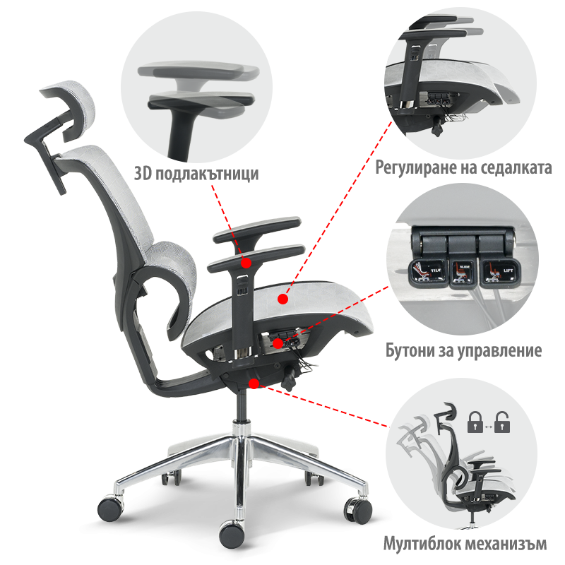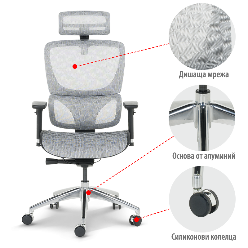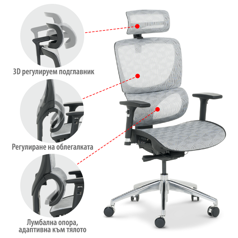 Ергономичният стол DELTA е стилен и функционален избор за вашия дом или офис, който комбинира съвременен дизайн с изключителен комфорт и удобство. Този модел разполага с множество функции за персонализиране: 3D подглавник, 3D подлакътници, лумбална опора и облегалка и седалка от дишаща мрежа с ергономична форма. Здравата алуминиева основа и силиконовите колелца осигуряват стабилност и плавно движение, което го прави идеален за всеки, който цени качеството и ефективността. Пълна информация за размерите и характеристиките на модела ще намерите в таб/поле "Техническа информация".