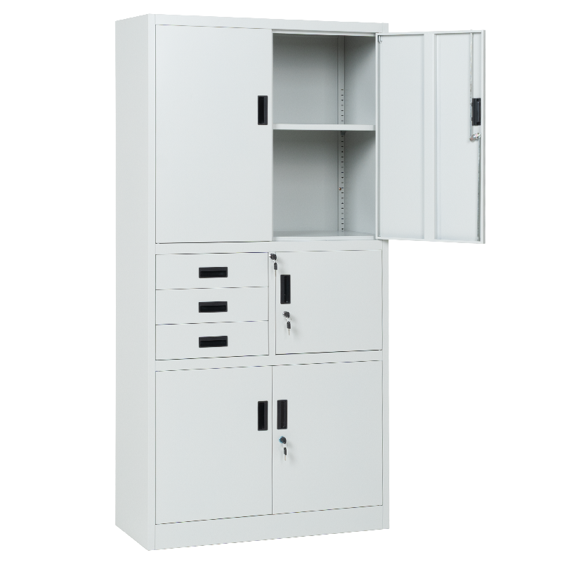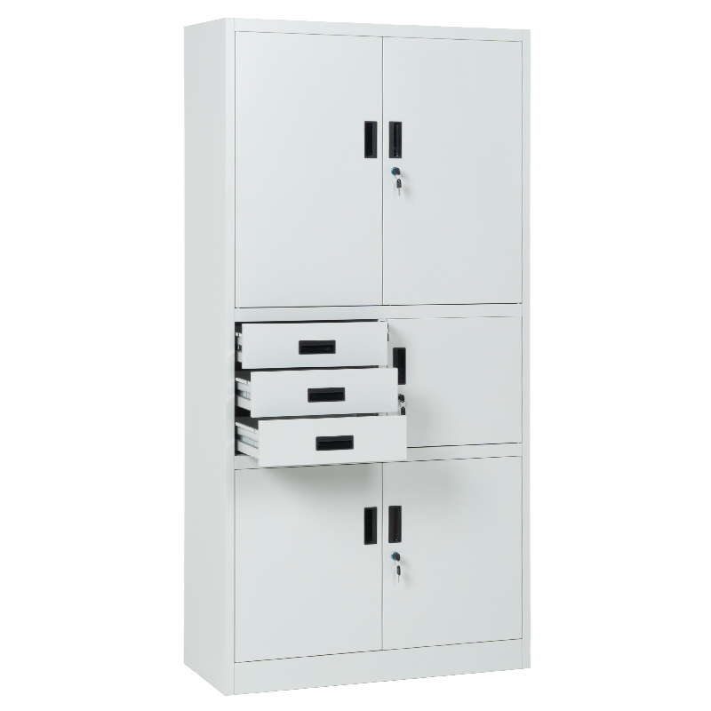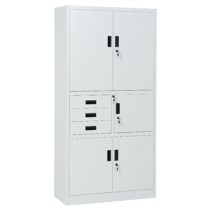 Carmen CR-1281 E K е метален шкаф за документи с удобно разпределение от две отделни шкафчета, 3 чекмеджета с общо заключване и 1 сейф. Всяко шкафче разполага с един рафт с регулируема височина и плътни врати със заключване. Пълна информация за размерите и характеристиките на модела ще намерите в таблицата в таб/поле "Техническа информация".