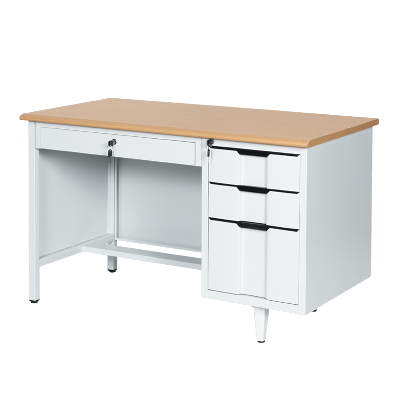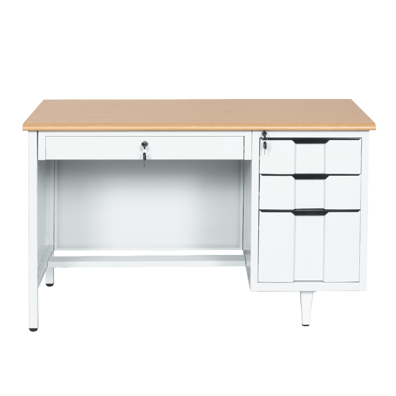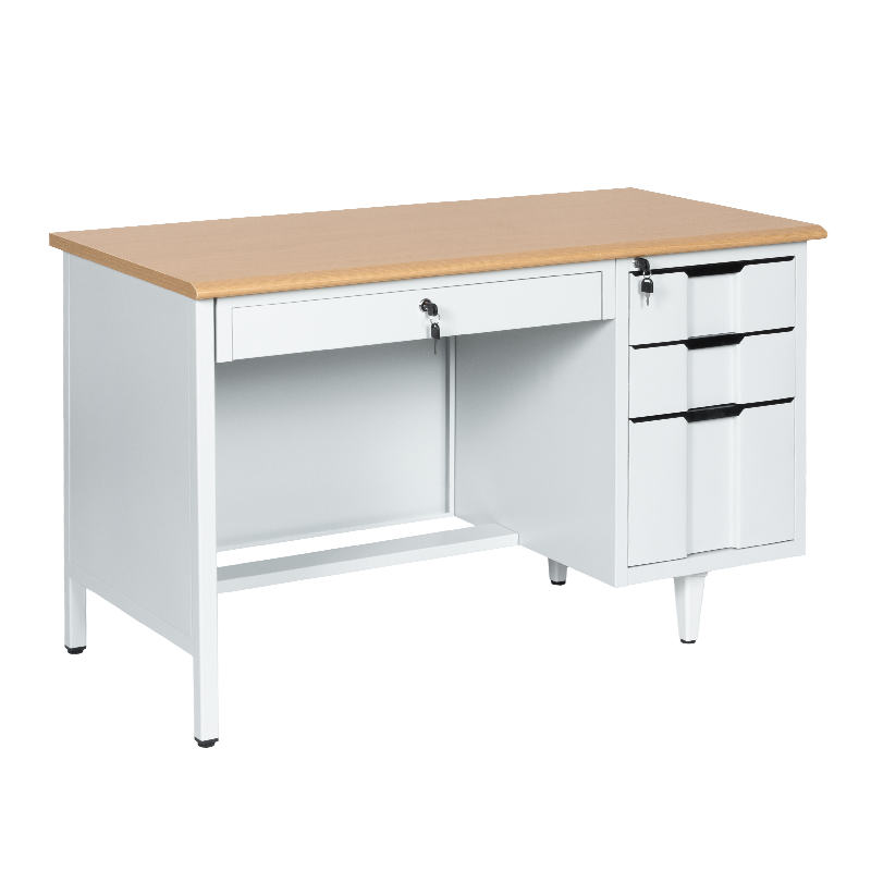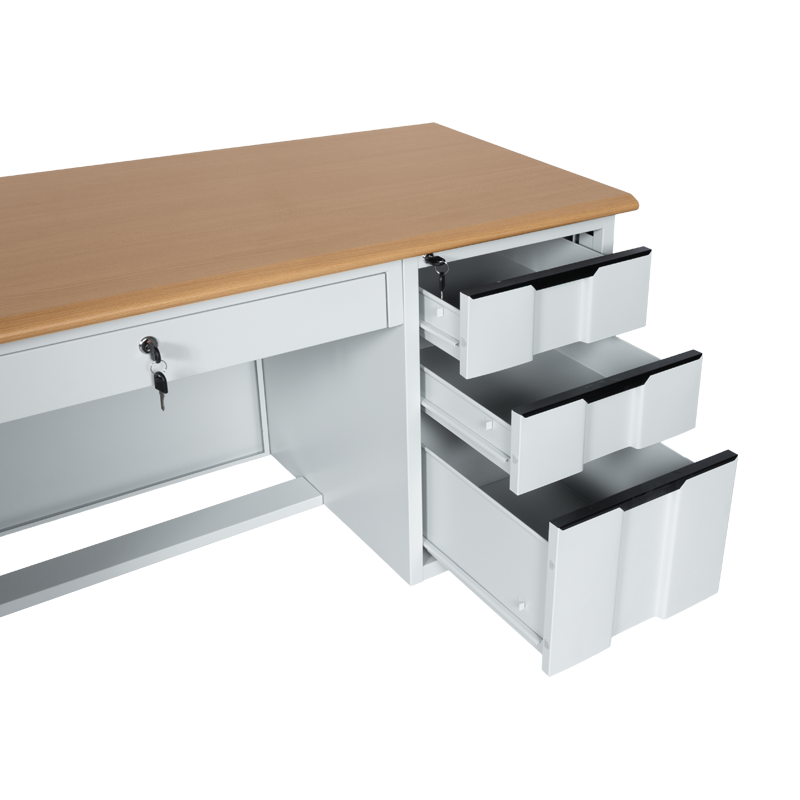 Бюрото Carmen CR-1310 K съчетава здравина и функционалност в изчистен, професионален дизайн. Конструкцията е изработена от праховобоядисан метал, а плотът е от MDF с меламиново покритие и дебелина 25 мм – стабилен и устойчив на натоварване. Моделът разполага с общо 4 чекмеджета, включително широко централно, като всички са оборудвани със заключване за по-добра сигурност на документите и вещите. На гърба са предвидени дискретни отвори за организиране на кабели, което го прави подходящо за офис, учебна среда или домашен работен кът.