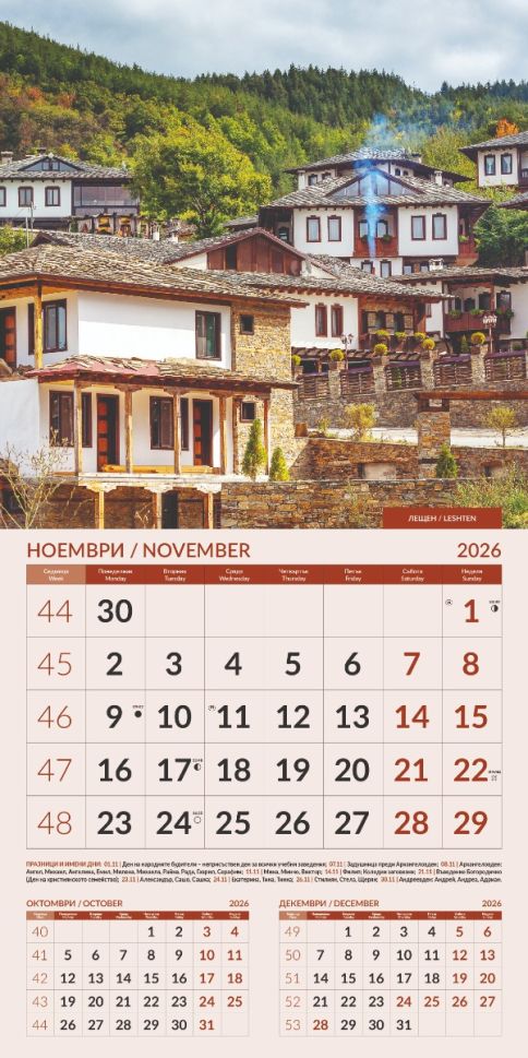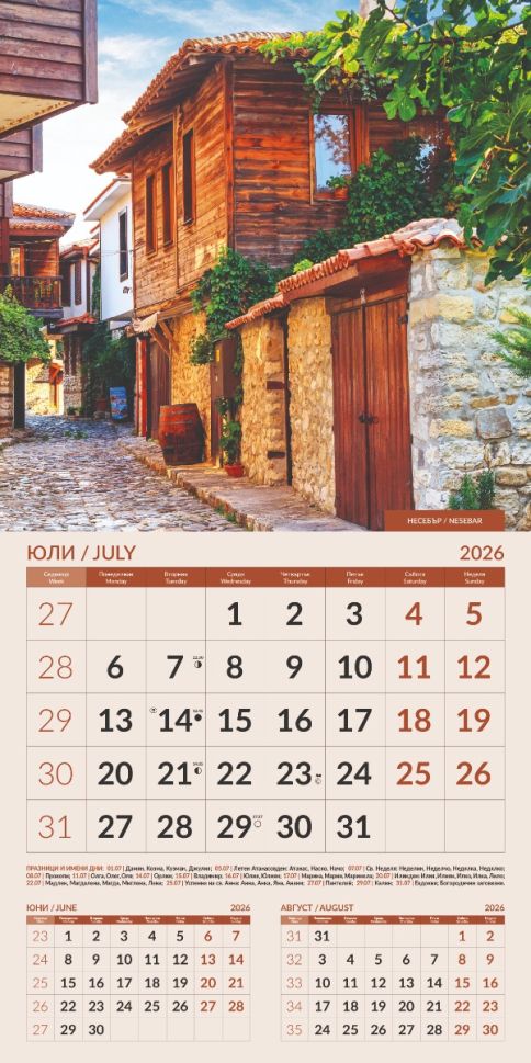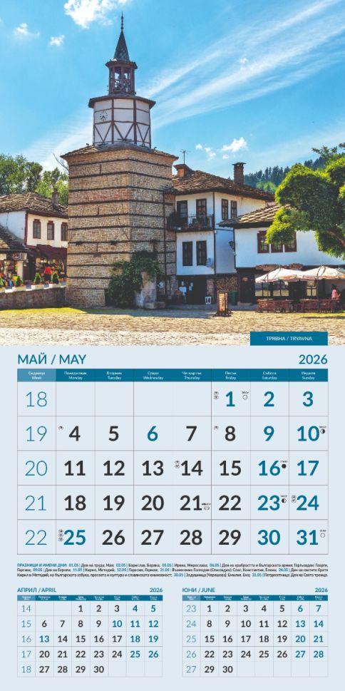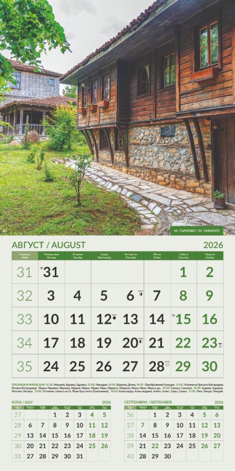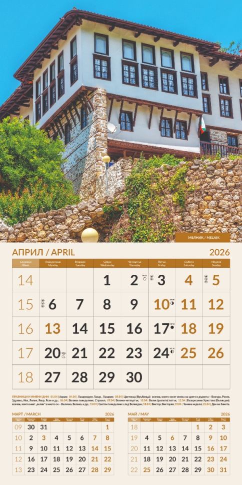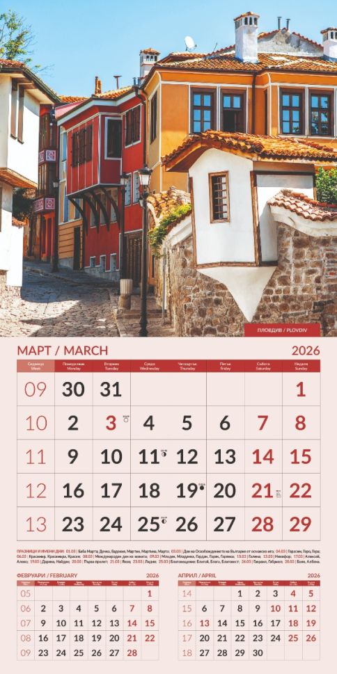 Сгънат формат: 30 х 30 cm + 3.5 cm удължена корица. Разгънат формат 30 х 63.5 cm Тяло: 12 листа (месеца), двустранен хром гланц, 4+4 цвята. Отбелязани официални и църковни празници, имени дни, лунен календар, зодии, международни празници GB, DE, FR Корица: 300 g/m2 гланц + UV лак Рекламна площ 30 х 3.5 cm Възможност за пълноцветен печат на основата при тираж над 500 броя Възможност за ситопечат 1 цвят при тираж над 100 броя или пълноцветен дигитален печат на стикер при тираж над 50 броя