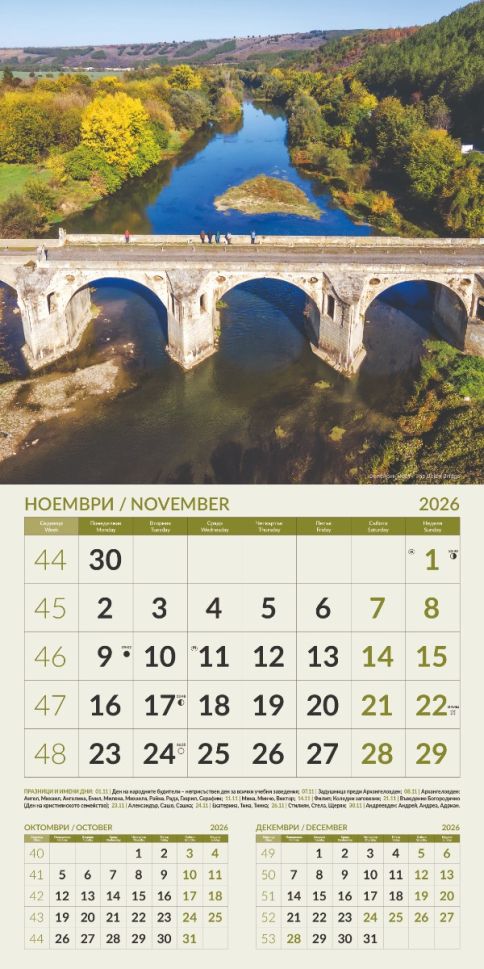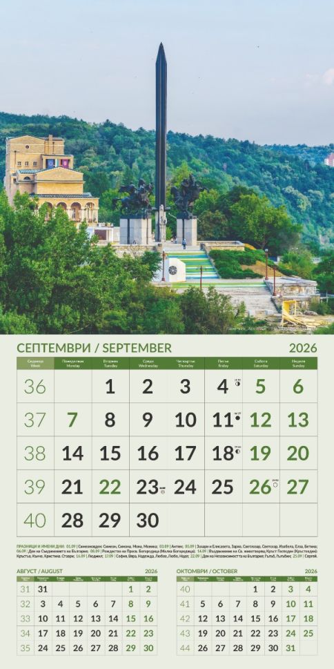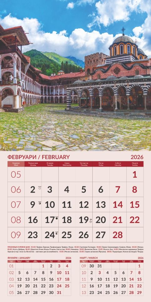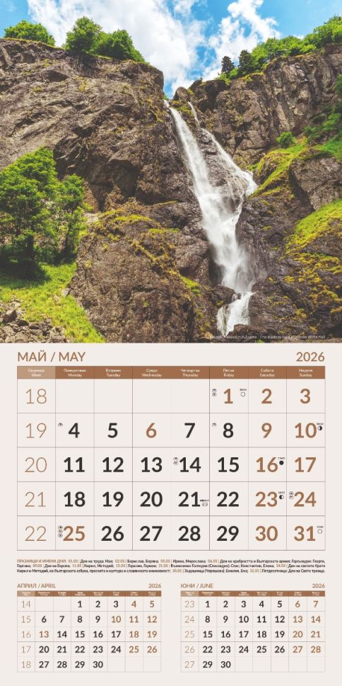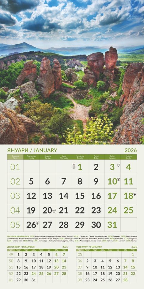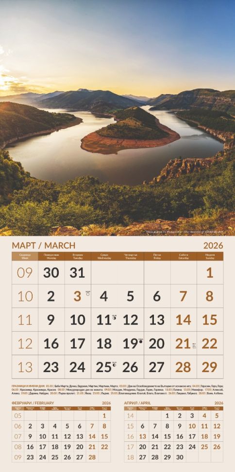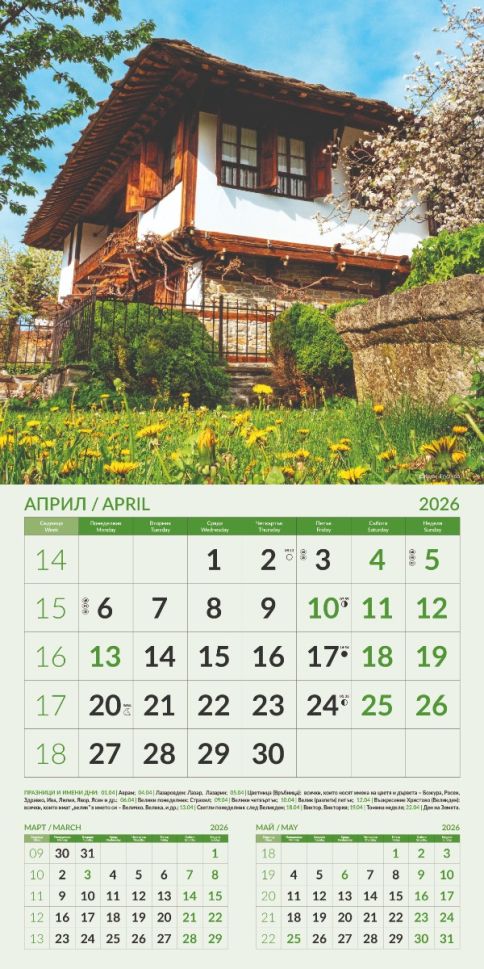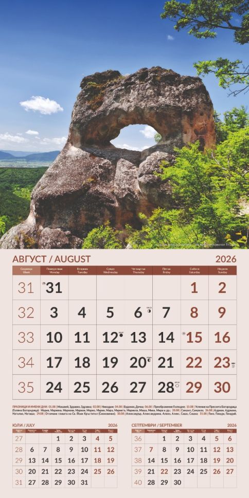 Сгънат формат: 30 х 30 cm + 3.5 cm удължена корица. Разгънат формат 30 х 63.5 cm Тяло: 12 листа (месеца), двустранен хром гланц, 4+4 цвята. Отбелязани официални и църковни празници, имени дни, лунен календар, зодии, международни празници GB, DE, FR Корица: 300 g/m2 гланц + UV лак Рекламна площ 30 х 3.5 cm Възможност за пълноцветен печат на основата при тираж над 500 броя Възможност за ситопечат 1 цвят при тираж над 100 броя или пълноцветен дигитален печат на стикер при тираж над 50 броя