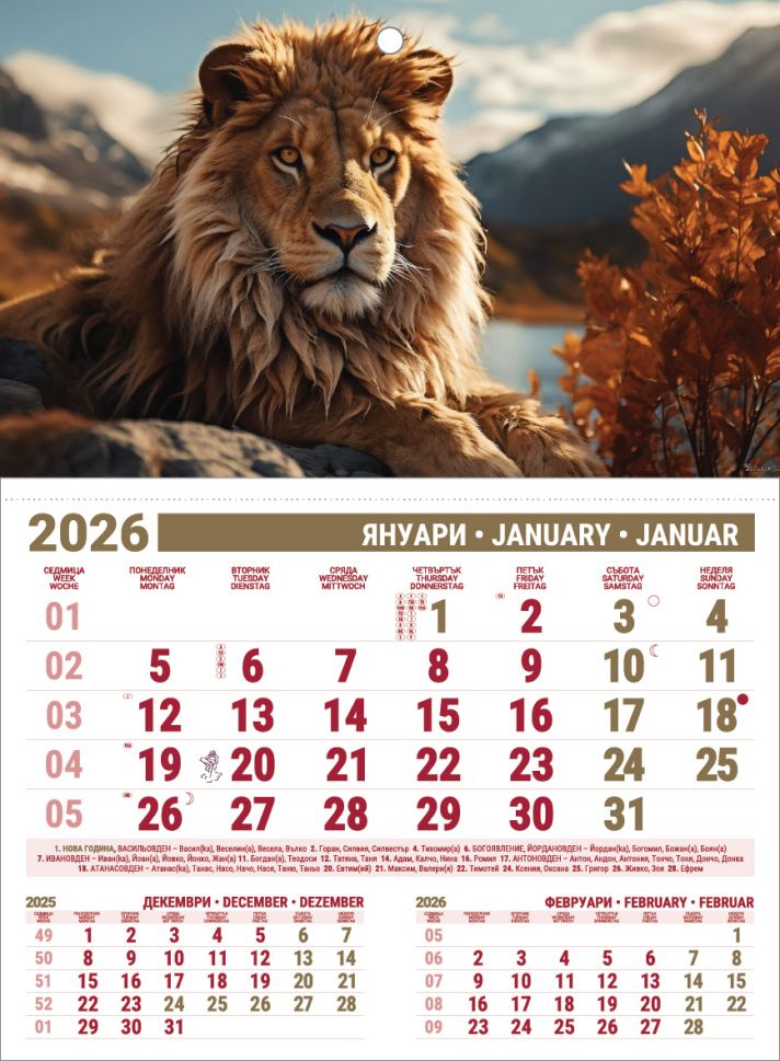 Възможност за глава (рекламнаплощ) размер: - 29.5 х 22 cmВъзможност за изработванена календар с цветна главапо индивидуален дизайн ифонирана подложка (32 х 48 cm)