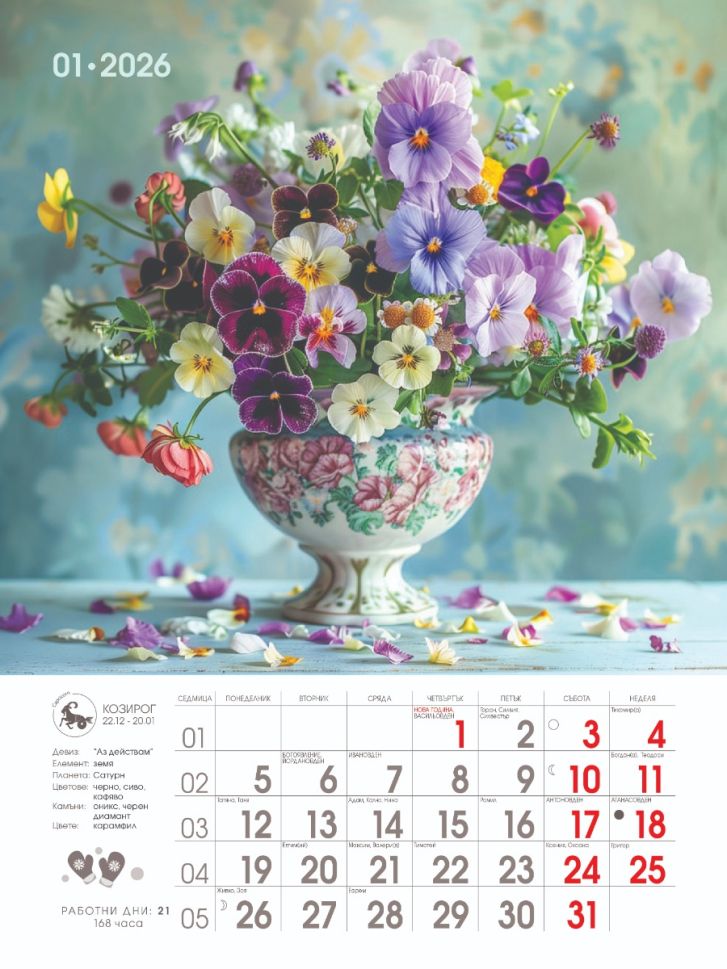 Сгънат формат: 24.4 х 33 cm. Отбелязани национални и църковни празници, имени дни, фази на луната, зодии и специфична информация за съответната тема на календара. Предлага се в 8 теми: Букети, Пейзажи, Пейзажи от България, Традиционна архитектура, Замъците на Европа, Планини, Сладки котенца, Сладки кученца