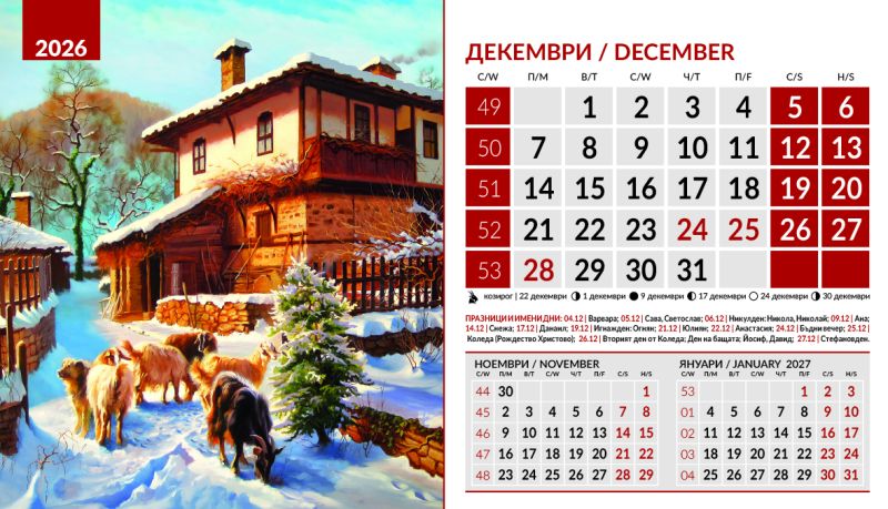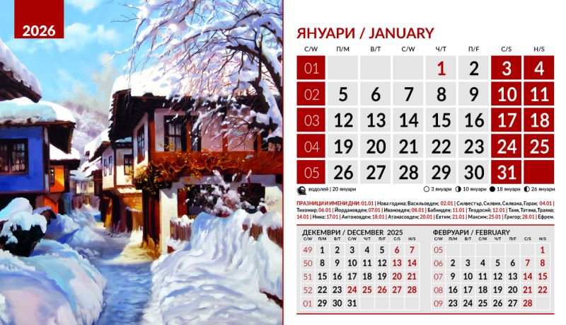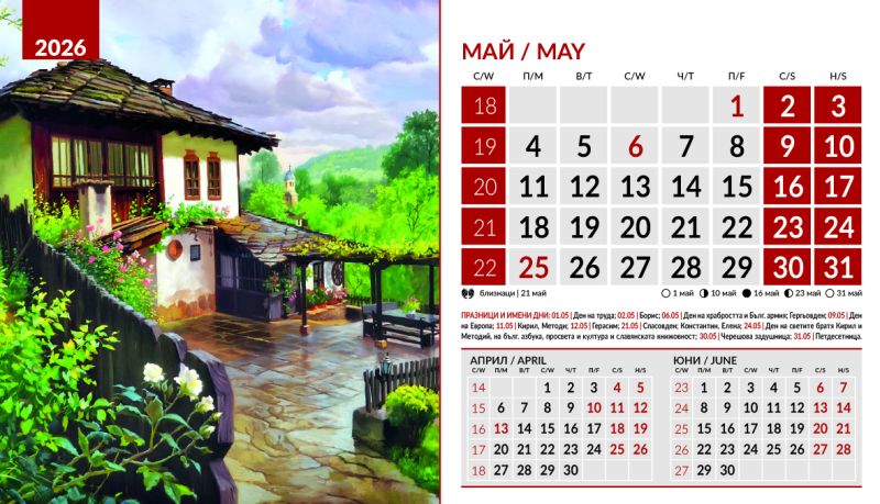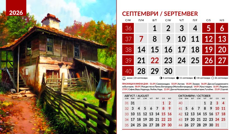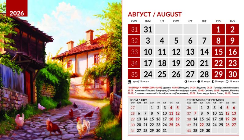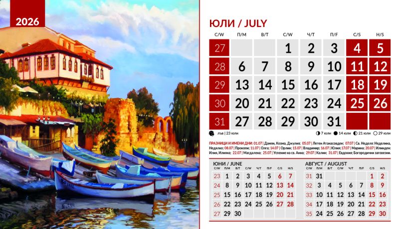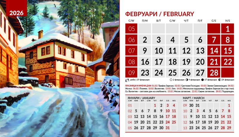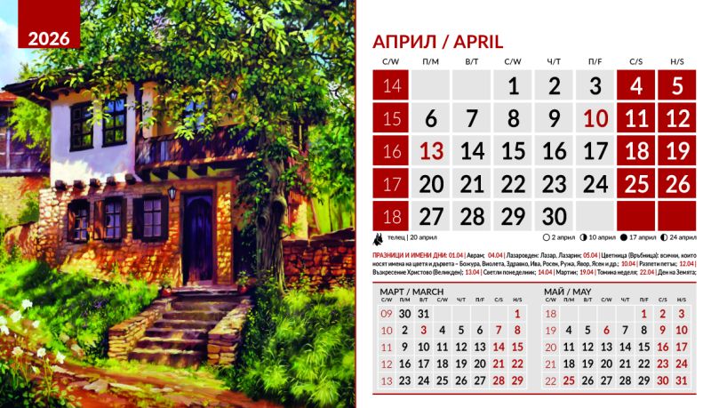 Тяло 12 листа (месеца), двустранен хром гланц, цветност: 4+0. Отбелязани празници и имени дни, лунни фази, зодии Корица: 200 g/m2 гланц с UV лак Основа: 280 g/m2 бял опаковъчен картон Рекламна площ 19.5 x 3 cm върху основата. Възможност за пълноцветен печат на основата при тираж над 500 броя Възможност за ситопечат 1 цвят при тираж над 100 броя или пълноцветен дигитален печат на стикер при тираж над 50 броя 19.5 x 11.2 cm