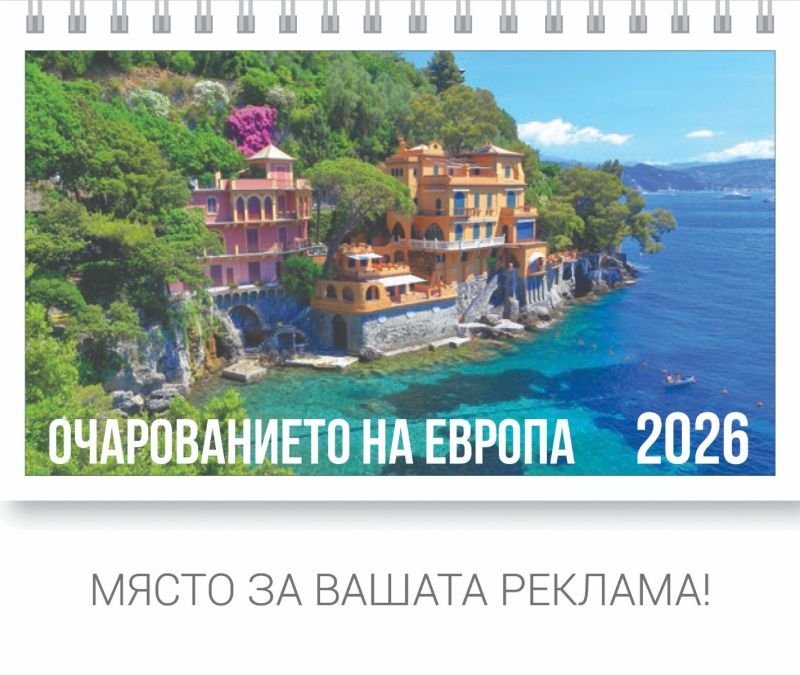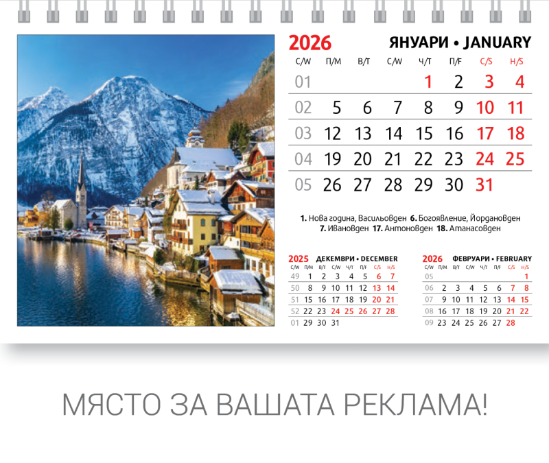 Тяло: 16 х 10 cm, 12 листа (месеца) двустранен хром гланц, цветност: 4+0. Отбелязани празници и имени дни, седмици.Подложка: 16 x 13.5 cm, 300 g/m2 бял опаковъчен картонЗахващане: със спиралаРекламна площ върху основата: 16 x 3.5 cm