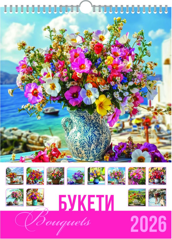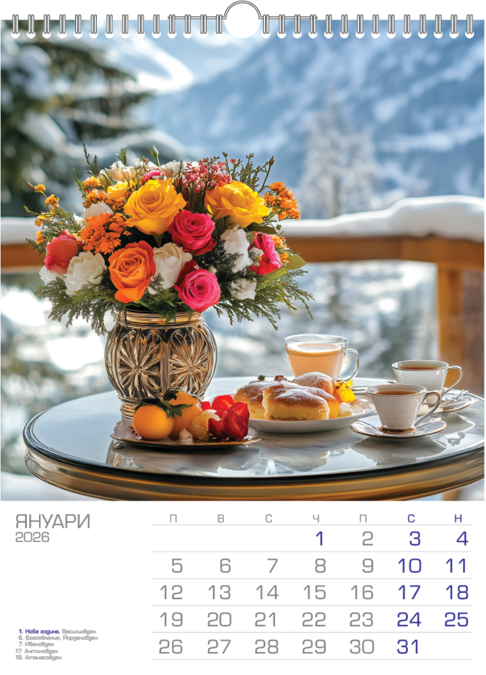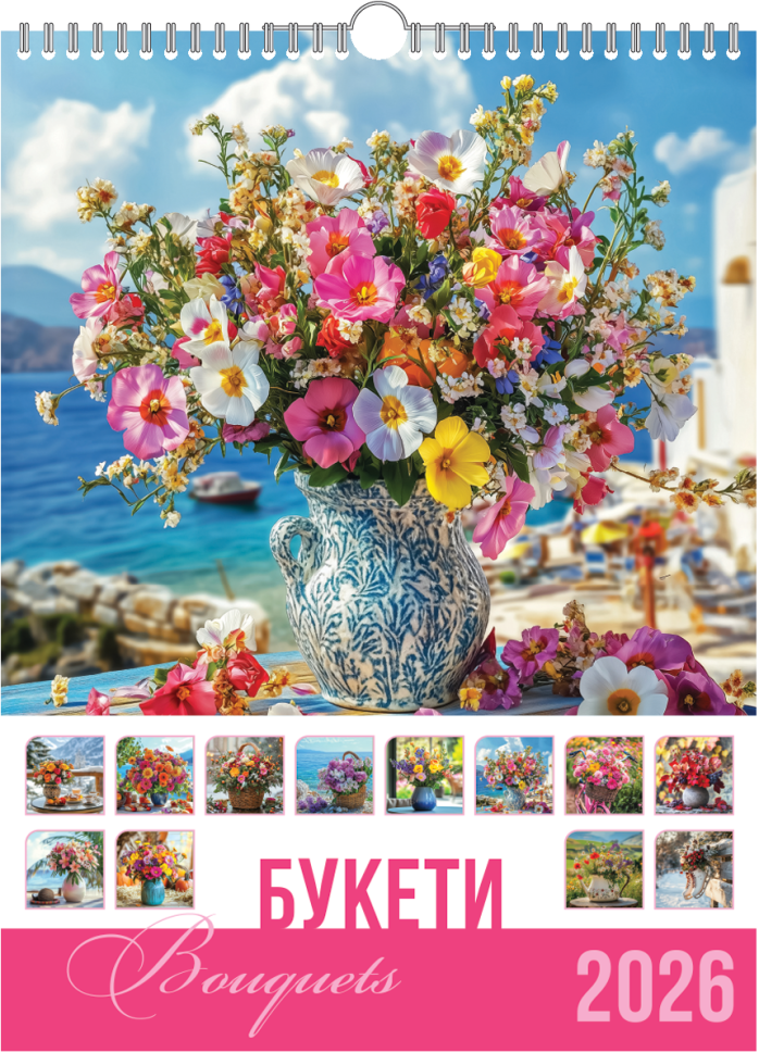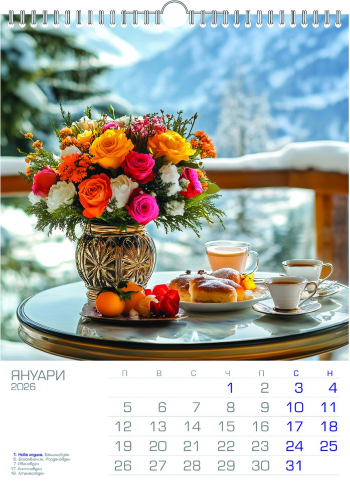 Сгънат формат: 31.4 х 43 cm. Тяло: 12 листа (месеца), двустранен хром гланц. Отбелязани официални и църковни празници. Корица: картон 350 g/m2. Захващане със спирала. Предлага се в 7 теми: Пейзажи от България, Водопади, Планини, Букети, Замъците на Европа, Цветовете на Европа, Живопис - Ивайло Николов