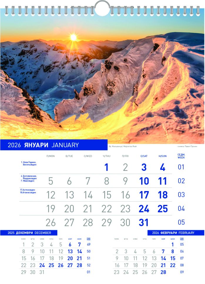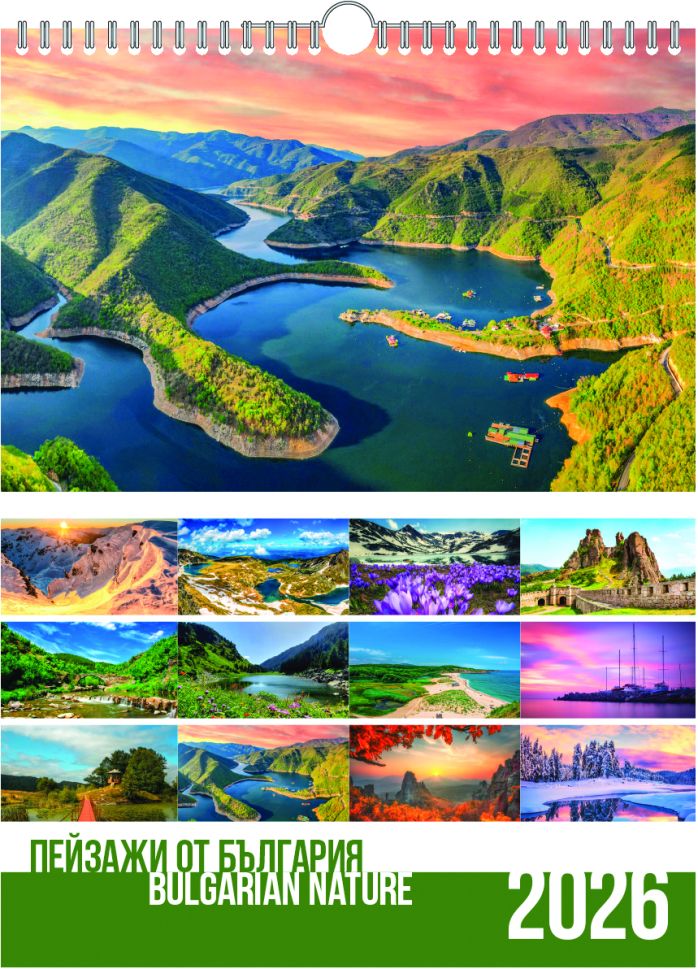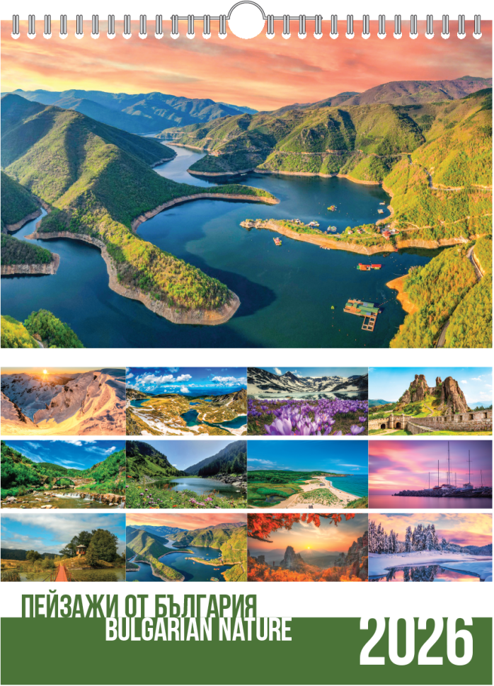 Сгънат формат: 31.4 х 43 cm. Тяло: 12 листа (месеца), двустранен хром гланц. Отбелязани официални и църковни празници. Корица: картон 350 g/m2. Захващане със спирала. Предлага се в 7 теми: Пейзажи от България, Водопади, Планини, Букети, Замъците на Европа, Цветовете на Европа, Живопис - Ивайло Николов