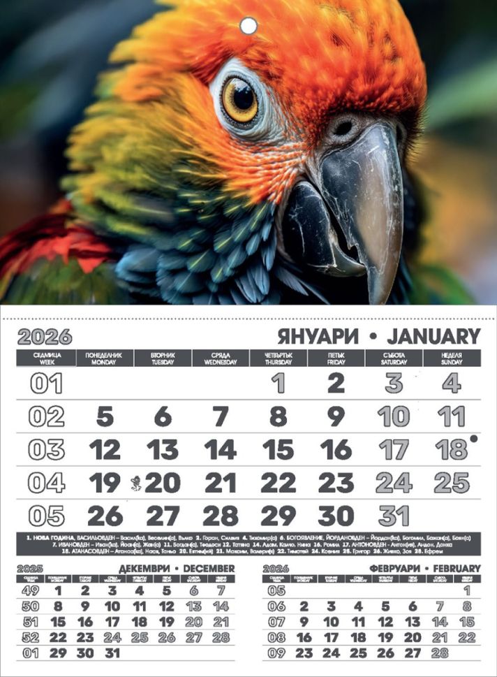 обща информация в средата на полето да се напише тяло върху бяла подложка една секция 12 листа с размери 29.5 х 22 cm, офсет 70 g/m2 картонена подложка 400 g/m2 опаковъчен картон размер на подложката- 32 х 48 cm с отбелязани фази на луната, имени дни, зодиак, църковни празници, официални празници, неработни дни в 56 държави прозорче за отбелязване на текущата дата опции: структурен картон, топъл печат, лакиране, ламиниране, метална капса, лайстна, кутия за календар от микровелпапе възможност за глава (рекламна площ) размер: - 29.5 х 21 cm възможност за изработване на календар с цветна глава по индивидуален дизайн и фонирана подложка под РКМ да се напише 1 цвят, 2 езика официални празници и неработни дни в 56 държави под РКМ Д да се напише 2 цвята, 3 езика официални празници и неработни дни в 21 държави