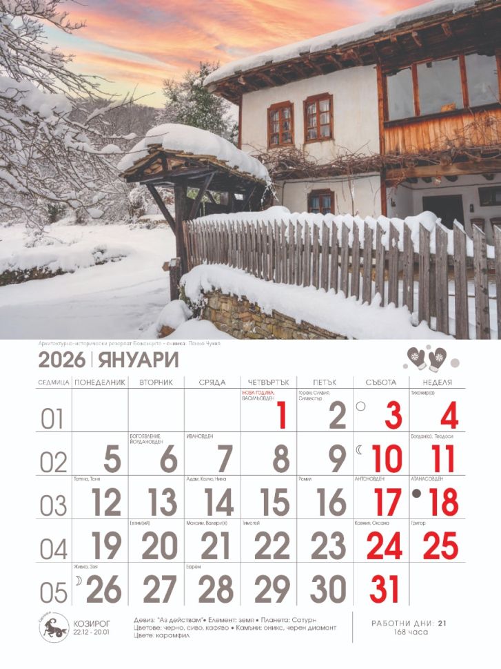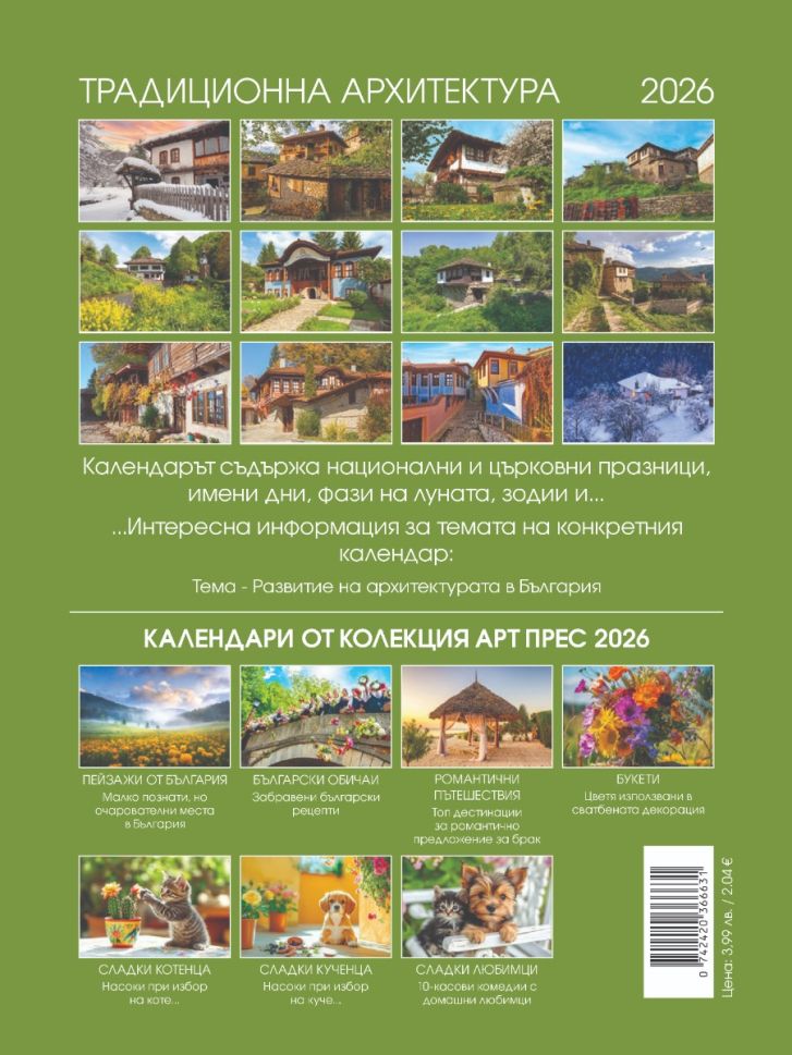 Сгънат формат: 24.4 х 33 cm. Отбелязани национални и църковни празници, имени дни, фази на луната, зодии и специфична информация за съответната тема на календара. Предлага се в 8 теми: Букети, Пейзажи, Пейзажи от България, Традиционна архитектура, Замъците на Европа, Планини, Сладки котенца, Сладки кученца