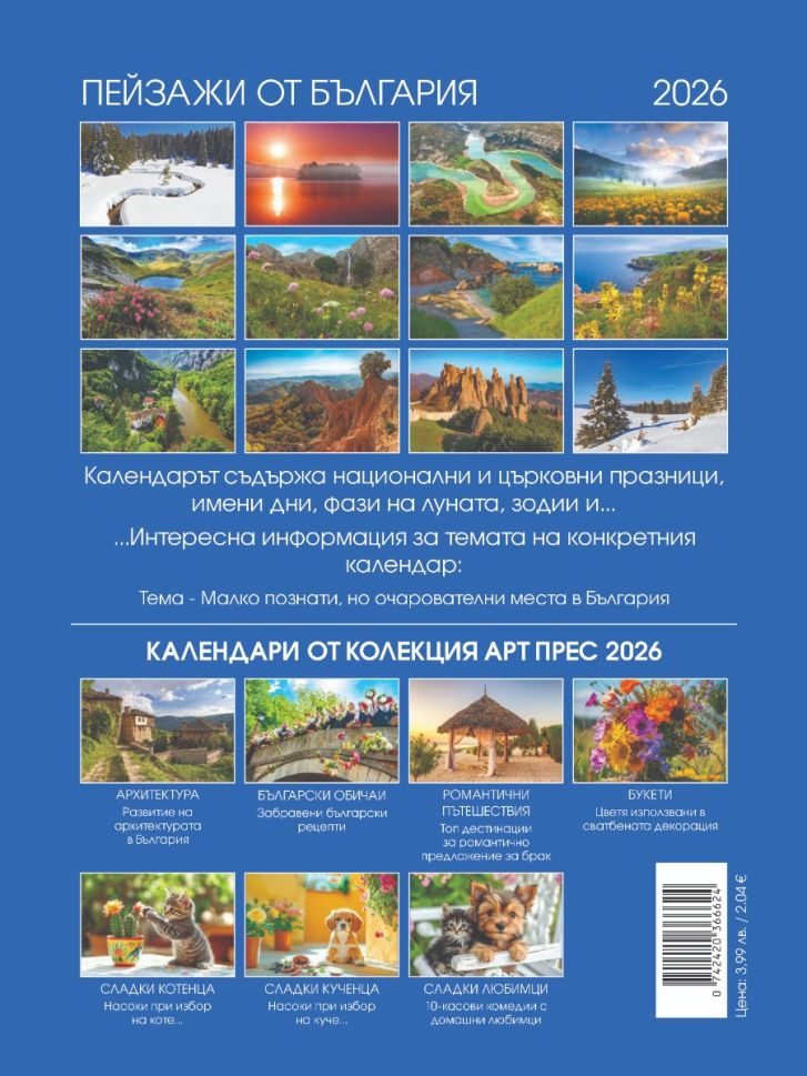 Сгънат формат: 24.4 х 33 cm. Отбелязани национални и църковни празници, имени дни, фази на луната, зодии и специфична информация за съответната тема на календара. Предлага се в 8 теми: Букети, Пейзажи, Пейзажи от България, Традиционна архитектура, Замъците на Европа, Планини, Сладки котенца, Сладки кученца