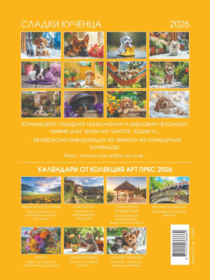 Сгънат формат: 24.4 х 33 cm. Отбелязани национални и църковни празници, имени дни, фази на луната, зодии и специфична информация за съответната тема на календара. Предлага се в 8 теми: Букети, Пейзажи, Пейзажи от България, Традиционна архитектура, Замъците на Европа, Планини, Сладки котенца, Сладки кученца