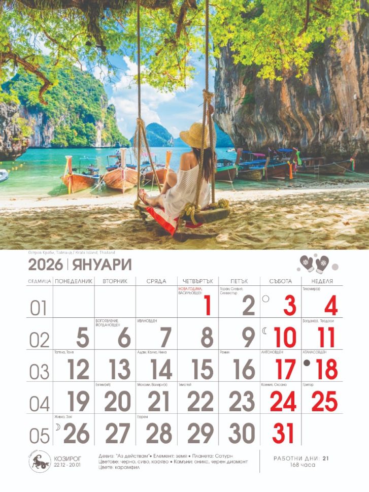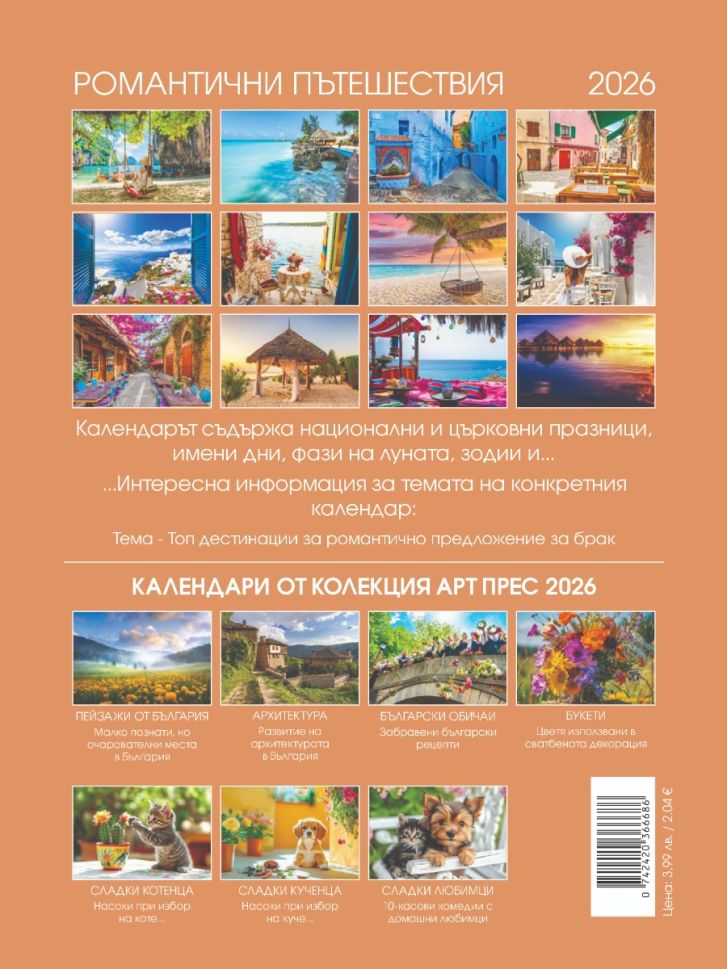 Сгънат формат: 24.4 х 33 cm. Отбелязани национални и църковни празници, имени дни, фази на луната, зодии и специфична информация за съответната тема на календара. За продажба в обекти
