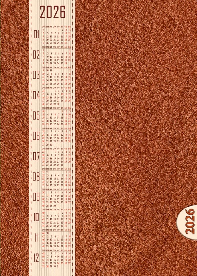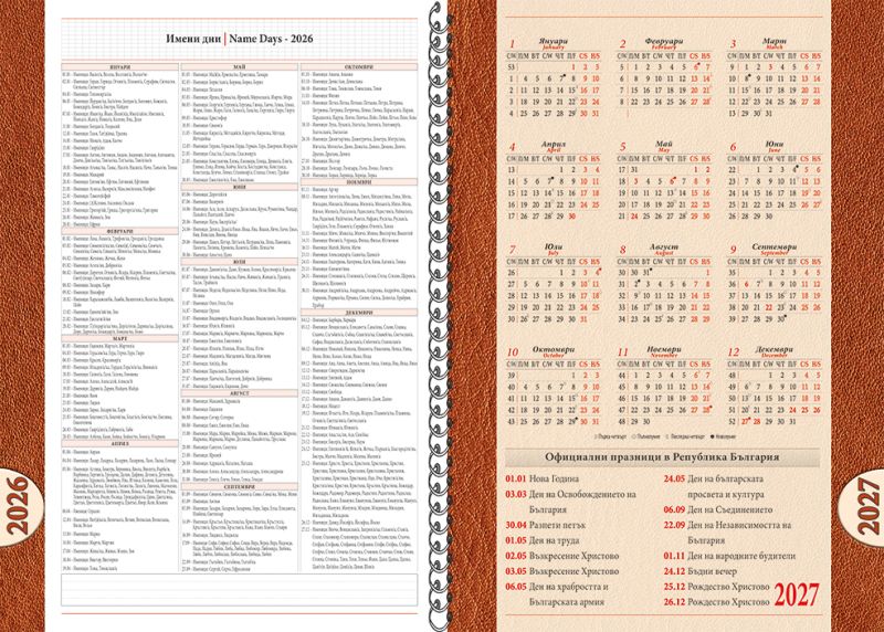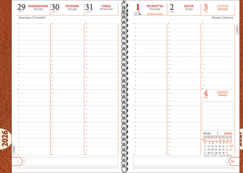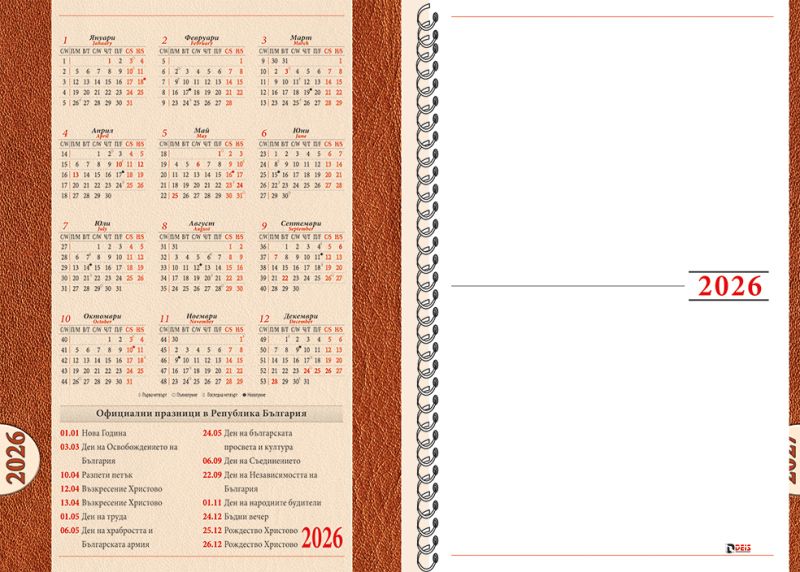 Размери: 17 х 24 cmС дати. Тяло офсет, печат 2 + 2 черно-червен, 2 страници - седмица. Информационни страници. Празници и имени дни, лунни фази, зодии. Скрита метална спирала. Корица интегрална подвързия. Възможност за печат на корица по индивидуален дизайн