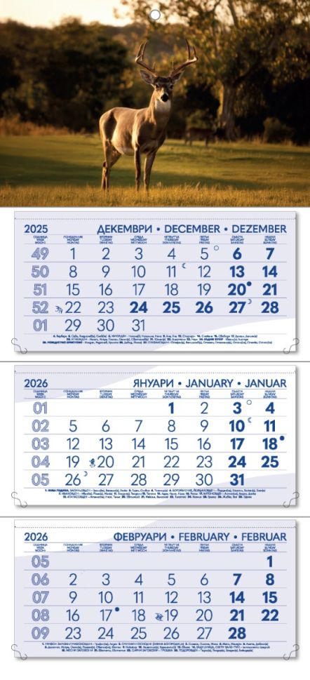 Възможност за глава (рекламнаплощ) размер: - 32 x 22 cmВъзможност за изработванена календар с цветна глава поиндивидуален дизайн и фониранаподложка (31.5 x 69 cm) или готовдизайн по каталог -