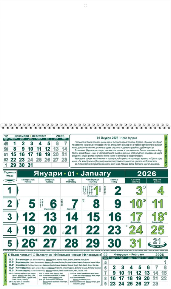 1 тяло върху бяла подложка.Подложка: 29.2 х 27.7 cm, 450 g/m2 едностранно хромов картон.Тяло: 29.2 х 27.7 cm, 12 листа. Офсет. 2 цвята печат. Официалнии църковни празници в България, официални празници в 30страни. С отбелязани имени дни и фази на луната, пореденномер на седмицата, начало на зодиакален знак.Захващане: с метална спирала.Възможност за глава (рекламна площ) размер - 29.2 х 20 cm.Възможност за изработване на календар с цветна глава поиндивидуален дизайн или готов дизайн по каталог