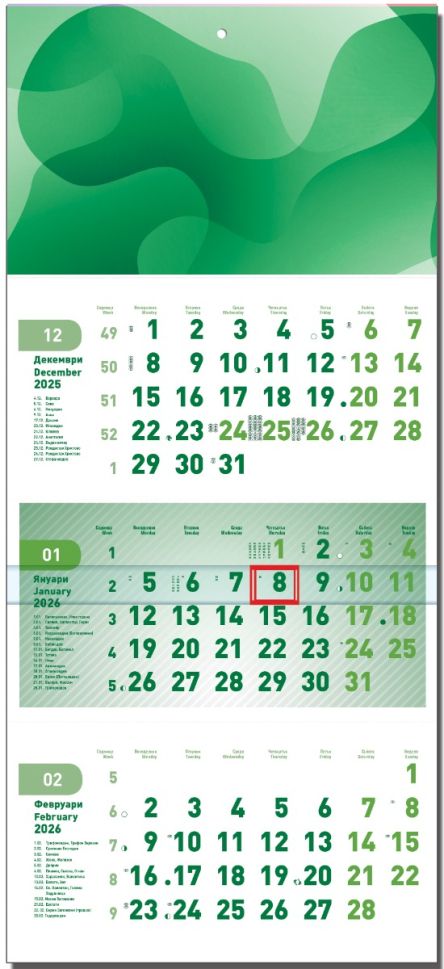3 секции върху бяла подложка. Размер на всяка секция - 28 х 14 cmПодложка: 30.5 х 48 cm, 300 g/m2 едностранно хромов картонТяло: 3 секции по 12 листа с микроперфорация. Офсет. 2 цвята печат. Официални празници в България и Европа. С отбелязани имени дни и фази на луната. Отбелязан пореден номер на седмицата, начало на зодиакален знак.Прозорче за отбелязване на текущата дата Опции: структурен картон; топъл печат, сухо преге, лакиране, ламиниране, метална капса, лайстнаВъзможност за глава (рекламна площ) размер - 30.5 х 23 cmВъзможност за изработване на календар с цветна глава и подложка по индивидуален дизайн
