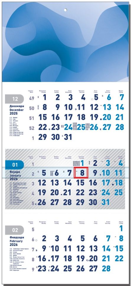 3 секции върху бяла подложка. Размер на всяка секция - 28 х 14 cmПодложка: 30.5 х 48 cm, 300 g/m2 едностранно хромов картонТяло: 3 секции по 12 листа с микроперфорация. Офсет. 2 цвята печат. Официални празници в България и Европа. С отбелязани имени дни и фази на луната. Отбелязан пореден номер на седмицата, начало на зодиакален знак.Прозорче за отбелязване на текущата дата Опции: структурен картон; топъл печат, сухо преге, лакиране, ламиниране, метална капса, лайстнаВъзможност за глава (рекламна площ) размер - 30.5 х 23 cmВъзможност за изработване на календар с цветна глава и подложка по индивидуален дизайн