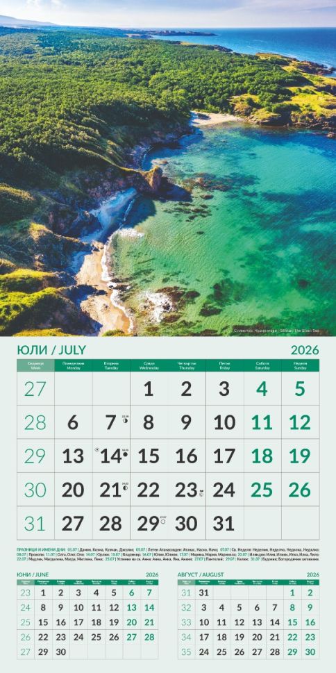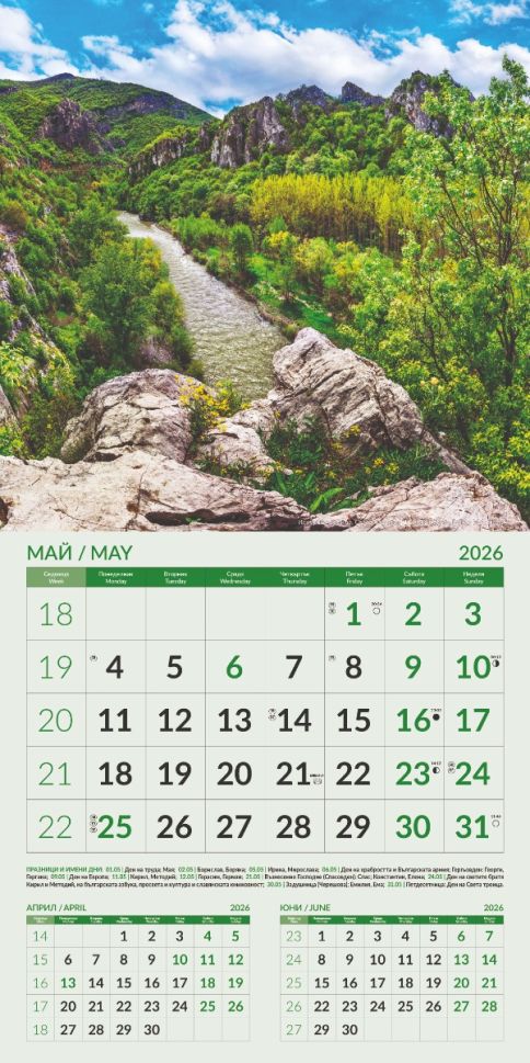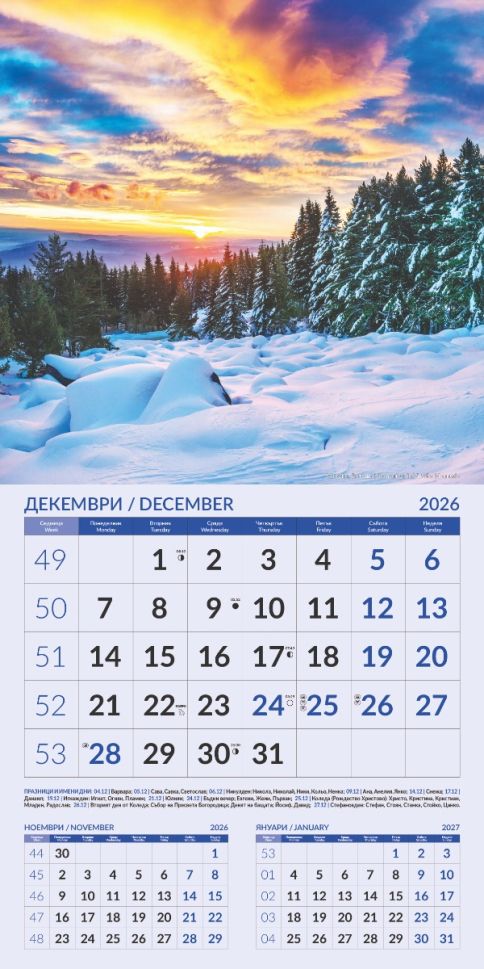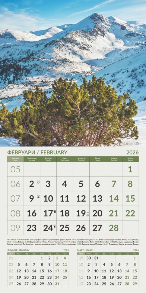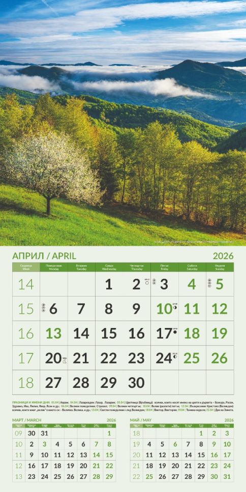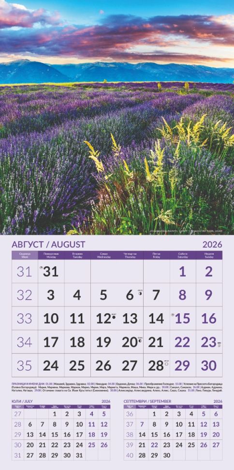 Сгънат формат: 30 х 30 cm + 3.5 cm удължена корица. Разгънат формат 30 х 63.5 cm Тяло: 12 листа (месеца), двустранен хром гланц, 4+4 цвята. Отбелязани официални и църковни празници, имени дни, лунен календар, зодии, международни празници GB, DE, FR Корица: 300 g/m2 гланц + UV лак Рекламна площ 30 х 3.5 cm Възможност за пълноцветен печат на основата при тираж над 500 броя Възможност за ситопечат 1 цвят при тираж над 100 броя или пълноцветен дигитален печат на стикер при тираж над 50 броя