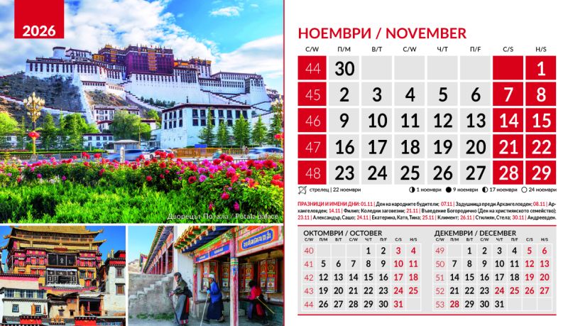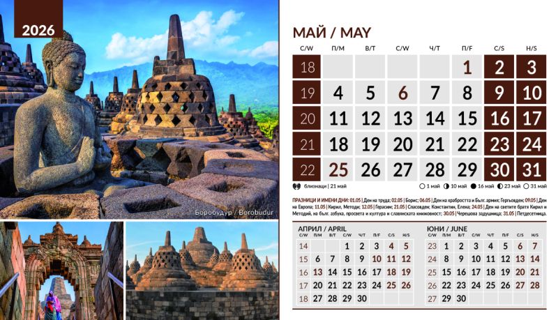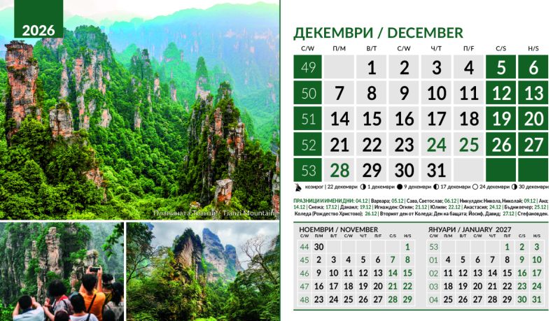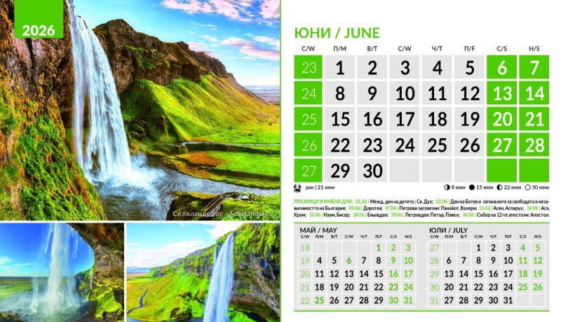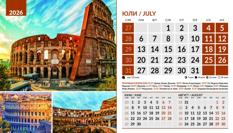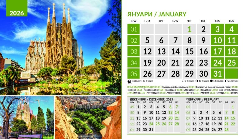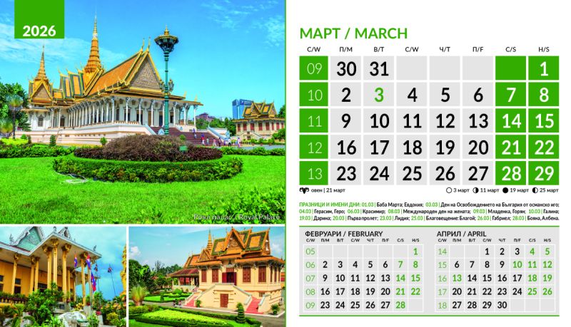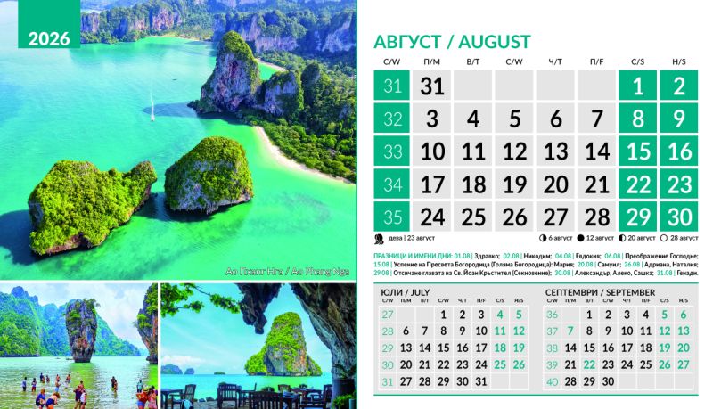19.5 x 11.2 cmТяло 12 листа (месеца), двустранен хром гланц, цветност: 4+0.Отбелязани празници и имени дни, лунни фази, зодииКорица: 200 g/m2 гланц с UV лакОснова: 280 g/m2 бял опаковъчен картонРекламна площ 19.5 x 3 cm върху основата