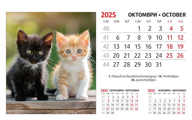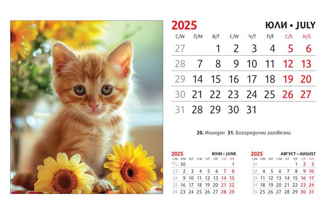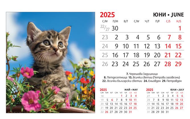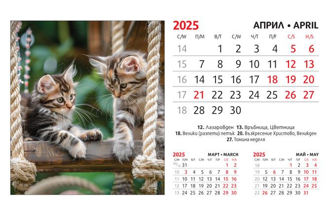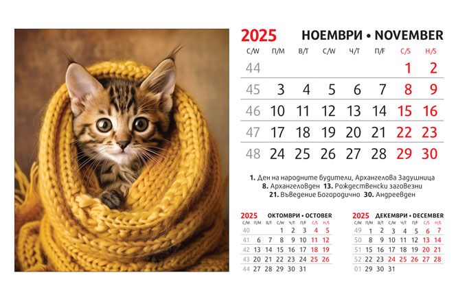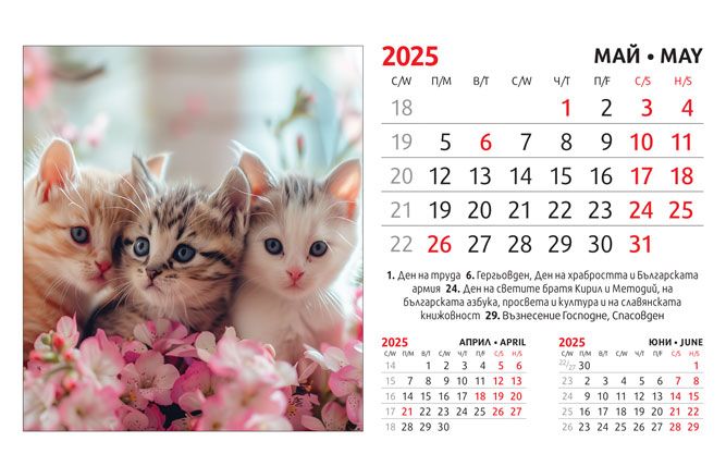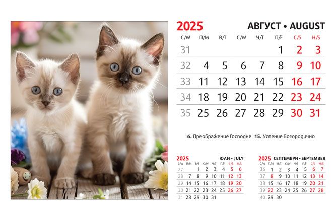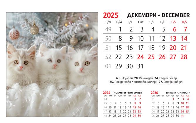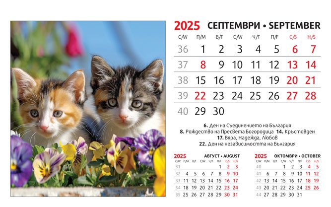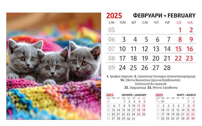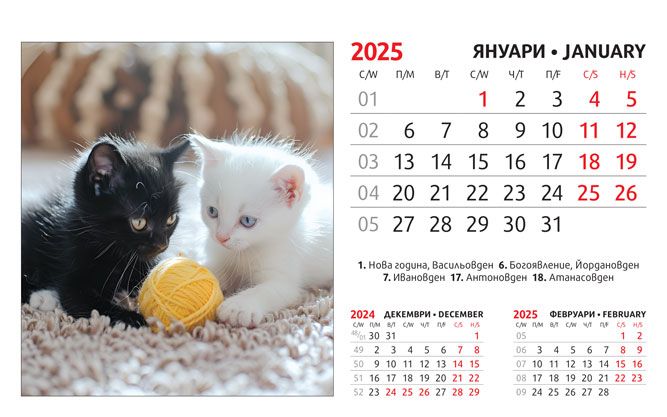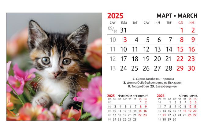 Тяло: 16 х 10 cm, 12 листа (месеца) двустранен хром гланц, цветност: 4+0. Отбелязани празници и имени дни, седмици. Подложка: 16 x 13.5 cm, 300 g/m2 бял опаковъчен картон Захващане: със спирала Рекламна площ върху основата: 16 x 3.5 cm