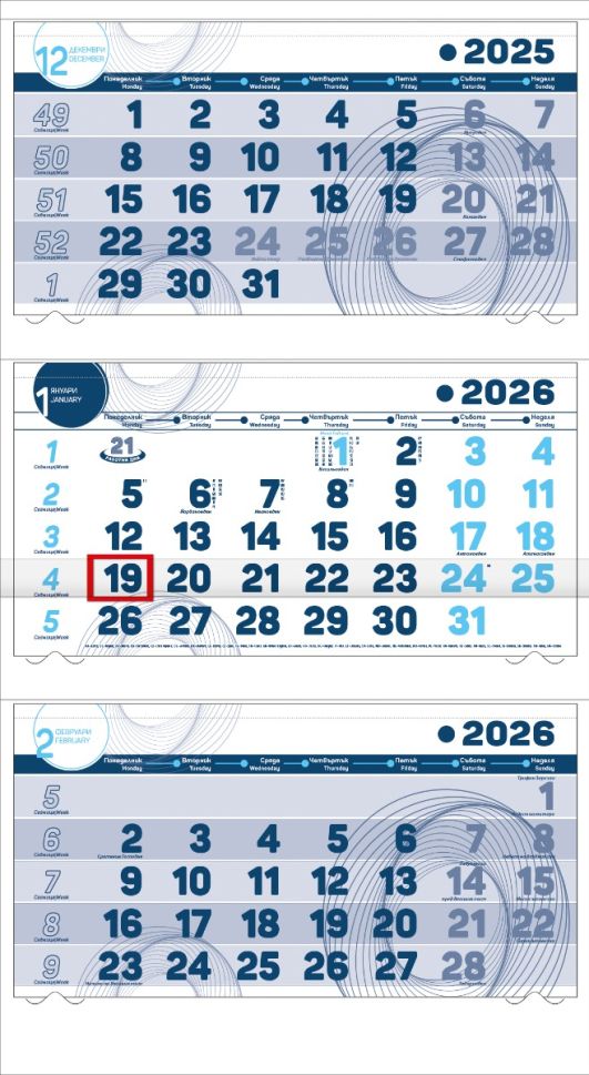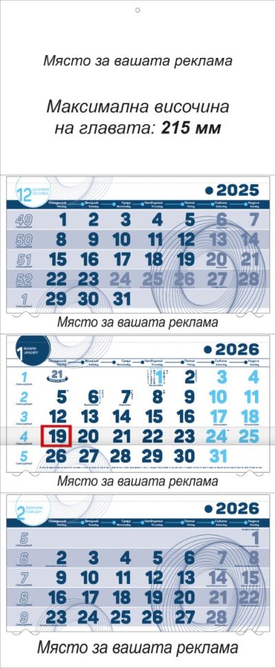 3 секции върху бяла подложка, сгъваемРазмер на всяка секция: 32.3 x 16.8 cmПодложка: 33.8 х 62.5 cm, 295 g/m2 едностранно хромов картон. Сгъваема, “уши” за всяка секцияТяло: 3 секции по 12 листа с микроперфорация. Офсет. 2 цвята печат. Календариум на 2 езика BG/EN. Официални празници в България и 30 страни. С отбелязани имени дни и брой работни дни.Възможност за изработване на календар с цветна глава по индивидуален дизайн - (рекламна площ) размер 33.8 х 21.5 cm