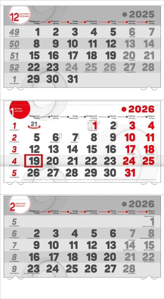 3 секции върху бяла подложка, сгъваемРазмер на всяка секция: 32.3 x 16.8 cmПодложка: 33.8 х 62.5 cm, 295 g/m2 едностранно хромов картон. Сгъваема, “уши” за всяка секцияТяло: 3 секции по 12 листа с микроперфорация. Офсет. 2 цвята печат. Календариум на 2 езика BG/EN. Официални празници в България и 30 страни. С отбелязани имени дни и брой работни дни.Възможност за изработване на календар с цветна глава по индивидуален дизайн - (рекламна площ) размер 33.8 х 21.5 cm