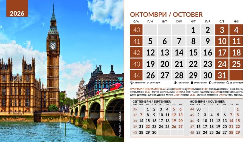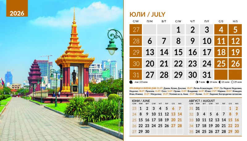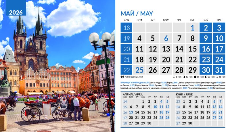 Тяло 12 листа (месеца), двустранен хром гланц, цветност: 4+0. Отбелязани празници и имени дни, лунни фази, зодии Корица: 200 g/m2 гланц с UV лак Основа: 280 g/m2 бял опаковъчен картон Рекламна площ 19.5 x 3 cm върху основата. Възможност за пълноцветен печат на основата при тираж над 500 броя Възможност за ситопечат 1 цвят при тираж над 100 броя или пълноцветен дигитален печат на стикер при тираж над 50 броя 19.5 x 11.2 cm