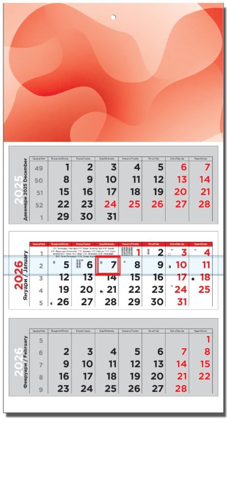 3 секции върху бяла подложка. Размер на всяка секция - 29 х 10.5 cmПодложка: 31 х 38 cm, 300 g/m2 едностранно хромов картонТяло: 3 секции по 12 листа с микроперфорация. Офсет. 2 цвята печат. Календариум на 2 езика BG/EN. Официални празници в България и Европа. С отбелязани имени дни и фази на луната. Отбелязан пореден номер на седмицата, начало на зодиакален знак.Прозорче за отбелязване на текущата дата Опции: структурен картон; топъл печат, сухо преге, лакиране, ламиниране, метална капса, лайстнаВъзможност за глава (рекламна площ) размер - 31 х 23 cmВъзможност за изработване на календар с цветна глава и подложка по индивидуален дизайн