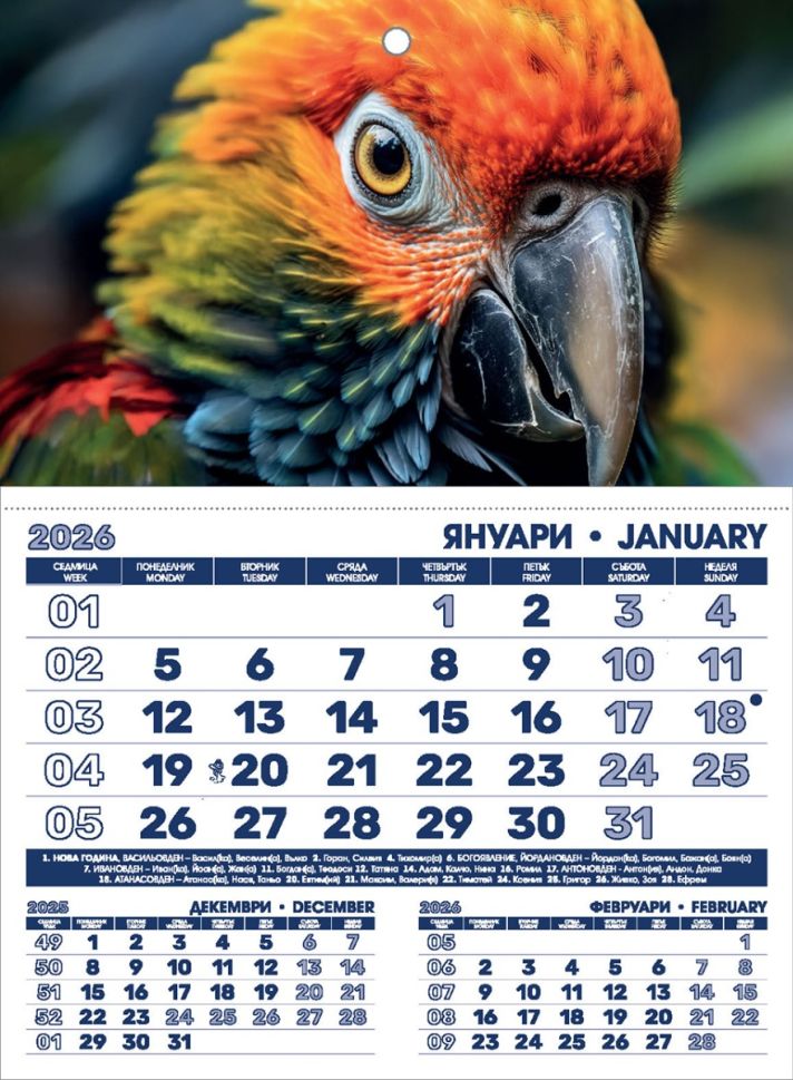 1 тяло върху бяла подложка.Подложка: 300 g/m2 финландски опаковъчен картонТяло: 29.5 х 22 cm, 12 листа с микроперфорация. Офсет. 2 цвята. 2 езика. С отбелязани фази на луната, имени дни, зодиак, църковни празници, официални празници, работни дни и часове.Прозорче за отбелязване на текущата датаВъзможност за глава (рекламна площ) размер: - 29.5 х 22 cmВъзможност за изработване на календар с цветна глава по индивидуален дизайн и фонирана подложка (32 х 48 cm) или готов дизайн - виж стр.23