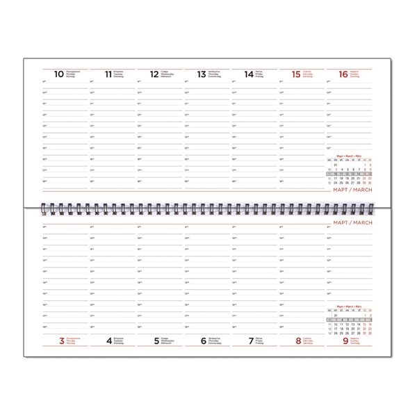 Тяло: 33 х 13.5 cm. С дати и календариум. 3 езика: BG/EN/DE. Офсет. Двуцветен печат. 2 страници с актуална телефонна информация. 2 страници за телефонни номера.Корици: бял картон - 33 х 17 cm, твърда подвързия - 34 х 17 cmЗахващане: с метална спиралаРекламна площ - цялата горна корица и ивицата с размер 33 х 3 cm (бял картон) и 34 х 3 cm (твърда подвързия) върху удължената долна корица