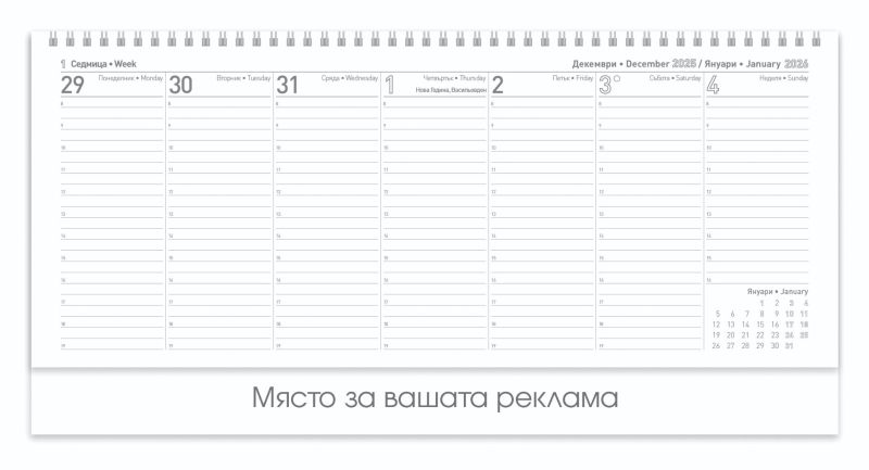 НК 7печат: 1 цвят, на 2 езикатяло: 56 стр. финландски офсет 70 g/m2, 7 дни на листкорица: финландски опаковъчен картон 300 g/m2захващане: метална спирала тип гребенВариант асорти за продажба в обекти - опаковка 10 броя (5 едноцветни и 5 пълноцветни)Възможност за печат на корица с индивидуален дизайн