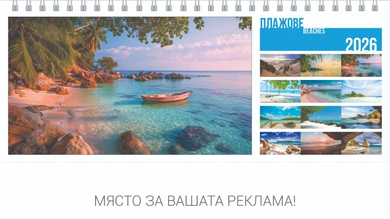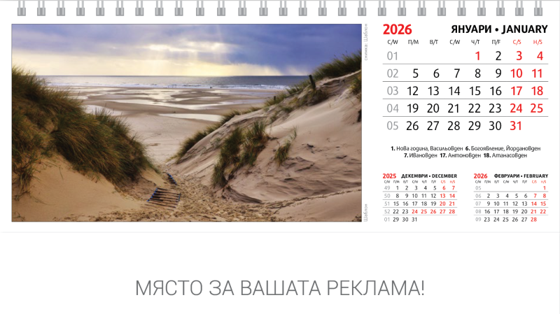 Тяло: 24 х 10 cm, 12 листа (месеца) двустранен хром гланц, цветност:4+0. Отбелязани празници и имени дни, седмици. Подложка: 24 x 13.8 cm, 300 g/m2 бял опаковъчен картон Захващане: със спирала Рекламна площ върху основата: 24 x 3.5 cm