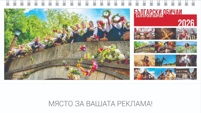 Тяло: 24 х 10 cm, 12 листа (месеца) двустранен хром гланц, цветност:4+0. Отбелязани празници и имени дни, седмици. Подложка: 24 x 13.8 cm, 300 g/m2 бял опаковъчен картон Захващане: със спирала Рекламна площ върху основата: 24 x 3.5 cm