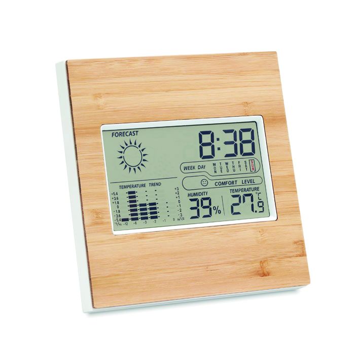 Пластмасов с бамбукова предна част.С термометър,хидрометър и календар.Работи с 2 батерии ААА(не са включени).