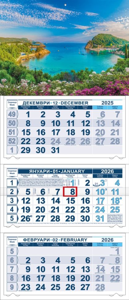 3 секции върху бяла подложка, сгъваемРазмер на всяка секция: 29.2 х 14.6 cmПодложка: 31 х 50.8 cm, 295 g/m2 едностранно хромов картон. Сгъваем, “уши” за всяка секцияТяло: 3 секции по 12 листа с микроперфорация. Офсет. 2 цвята печат. Календариум на 2 езика BG/EN. Официални празници в България и 30 страни. С отбелязани имени дни и фази на луната, начало на зодиакален знак, брой работни дни.Възможност за изработване на календар с цветна глава по индивидуален дизайн - (рекламна площ) размер - 31 x 22 cm