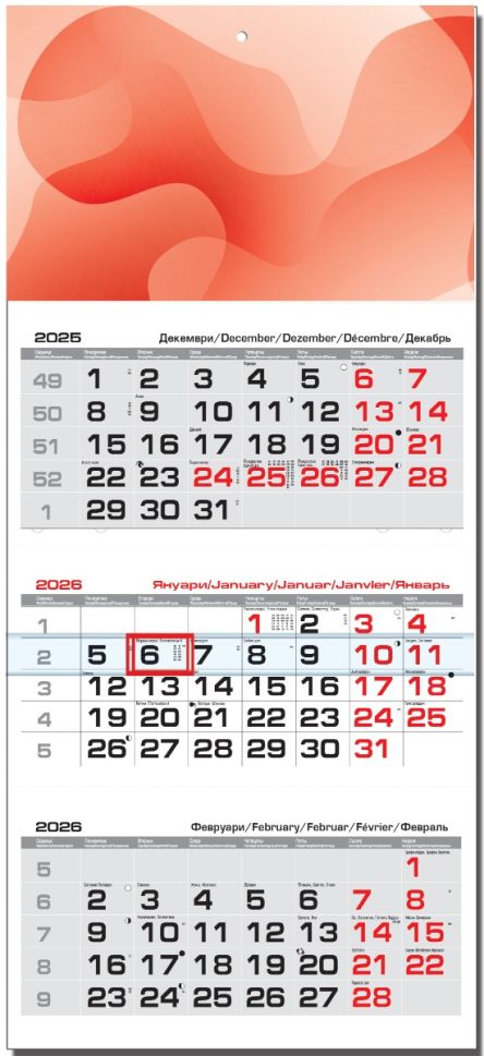 3 секции върху бяла подложка. Размер на всяка секция - 28 х 14 cmПодложка: 30.5 х 48 cm, 300 g/m2 едностранно хромов картонТяло: 3 секции по 12 листа с микроперфорация. Офсет. 2 цвята печат. Официални празници в България и Европа. С отбелязани имени дни и фази на луната. Отбелязан пореден номер на седмицата, начало на зодиакален знак.Прозорче за отбелязване на текущата дата Опции: структурен картон; топъл печат, сухо преге, лакиране, ламиниране, метална капса, лайстнаВъзможност за глава (рекламна площ) размер - 30.5 х 23 cmВъзможност за изработване на календар с цветна глава и подложка по индивидуален дизайн