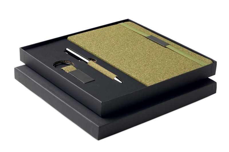 Включва метална химикалка с туист механизъм, ключодържател, бележник А5 160 стр, изработени от рециклирани материали. 22.6 х 21.6 х 2.5 cm