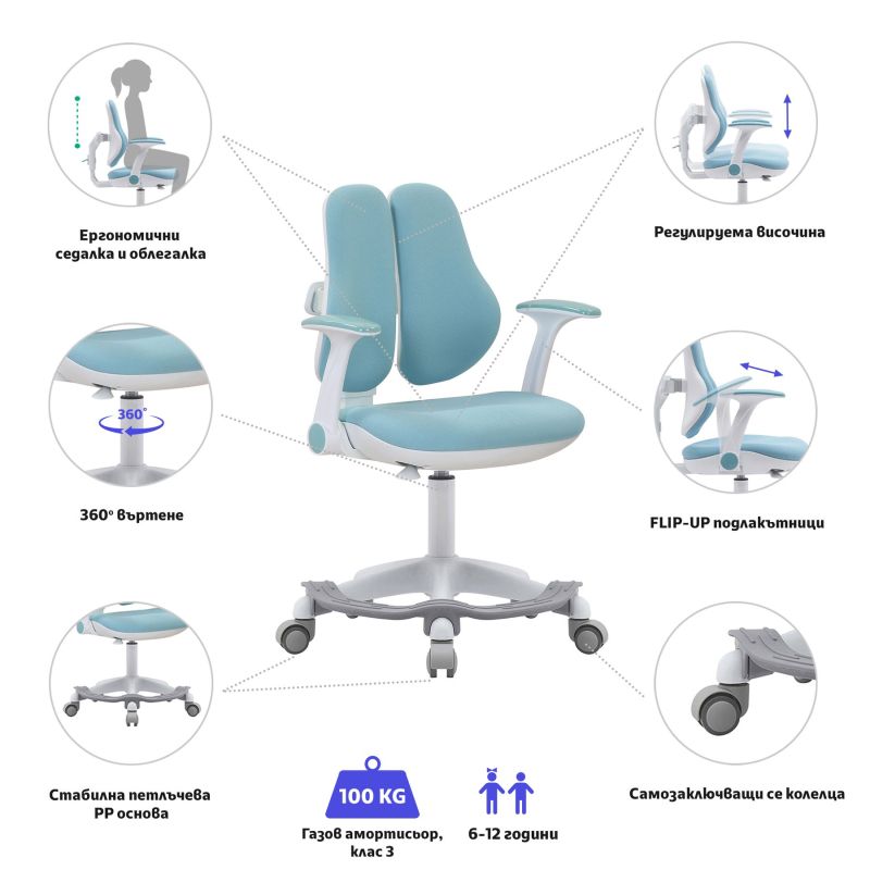 Детски стол RFG Ergo Cute White, текстил, до 100 kg, син
