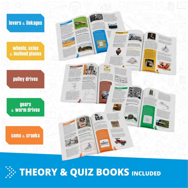 Сглобете 60 работещи модела, които обхващат темите за лоста, клина, колелото и оста, винта, наклонената плоскост, ролката, както и по-напредналите зъбни колела и връзки!