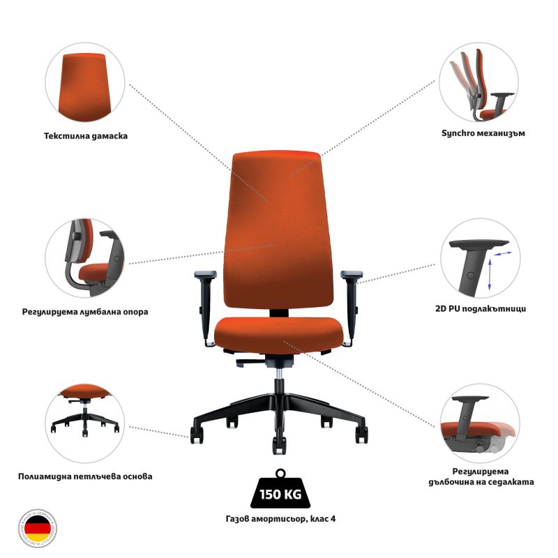 Ергономичен стол Interstuhl Goal 24/7, текстил, Synchronous механизъм, полиамидна основа, до 150 kg, оранжев