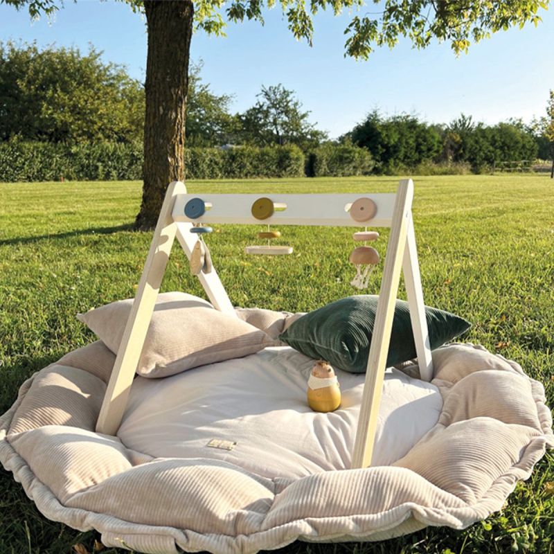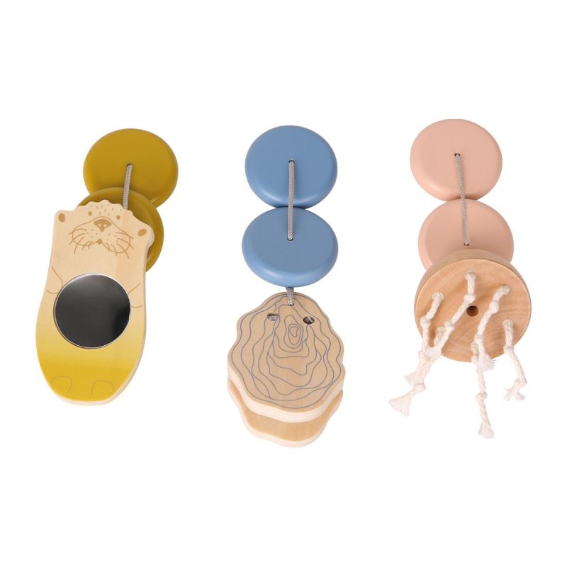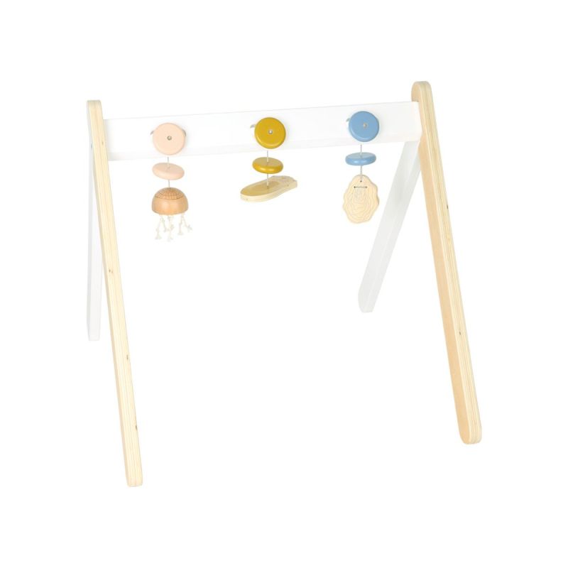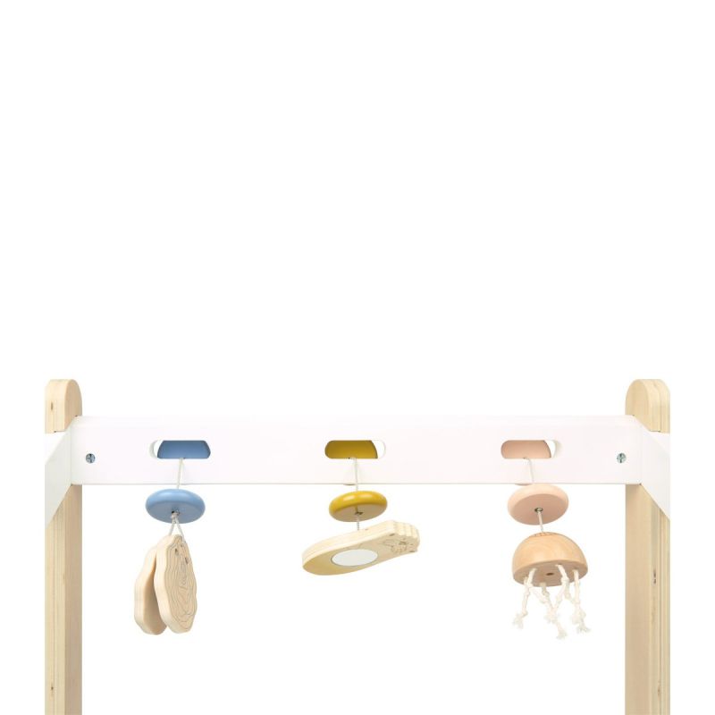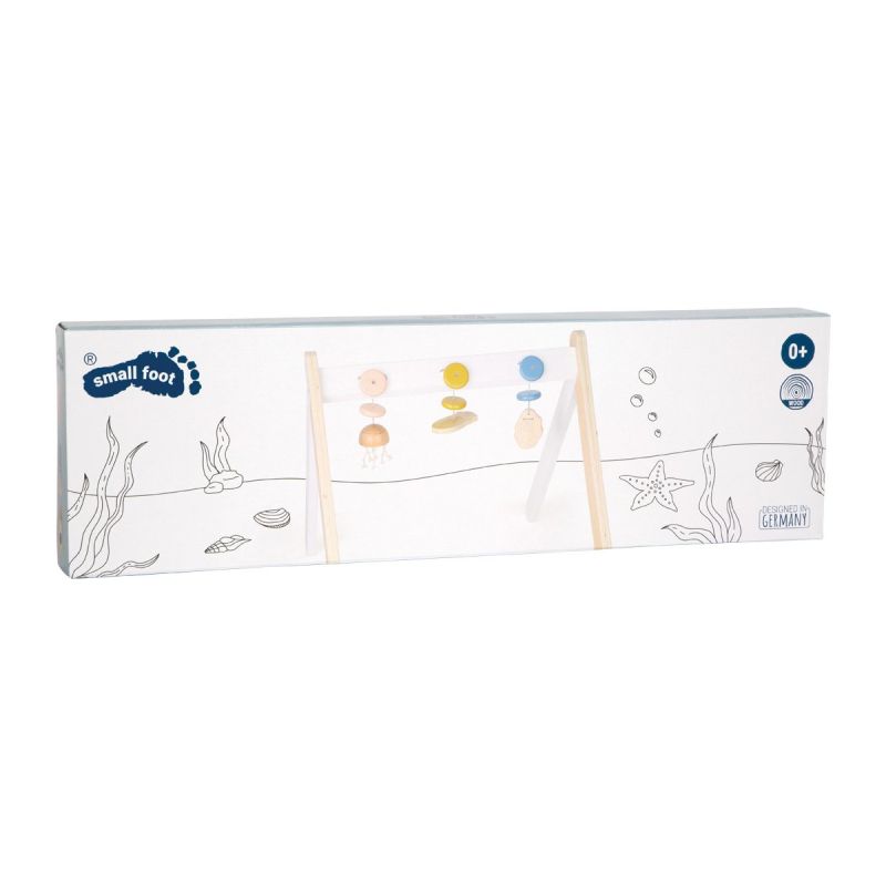 Тази модерна бебешка арка, изработена от дърво предлага всякакви страхотни стимули: морска видра с огледало, за да може детето да се види, медуза с връв за пипала за докосване и стрида, която трака като кастанет за акустични стимули.