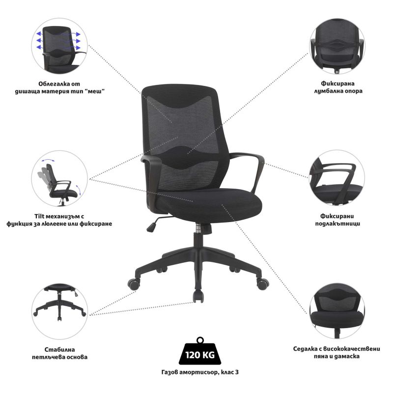 Седалката, изработена от висококачествена пяна е тапицирана с текстилна дамаска за чудесен завършек на визията му, а облегалката с лумбална форма е изработена от дишаща материя тип „меш“, която позволява на въздуха да циркулира свободно и елиминира вероятността от изпотяване и неприятна миризма. Лумбалната опора се грижи за правилната стойка и предотвратява неприятните болки в гърба и кръста. Благодарение на нея отново ще се чувствате свежи и тонизирани в края на работния ден, лишени от всякакво напрежение и умора.