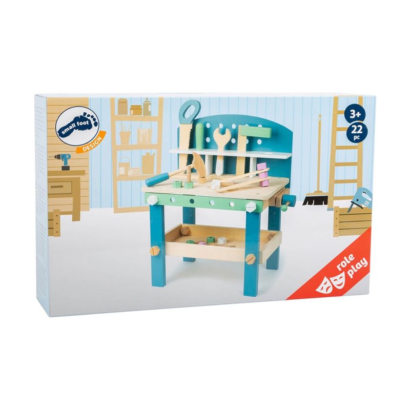 Дървената работилница, насърчава сръчността на децата. Завиването на болтчета и рязането с трион ще стимулират фините двигателни умения у децата. Приятните цветове, изчистените форми и семплият скандинавски дизайн са подходящи както за момичета, така и за момчета.