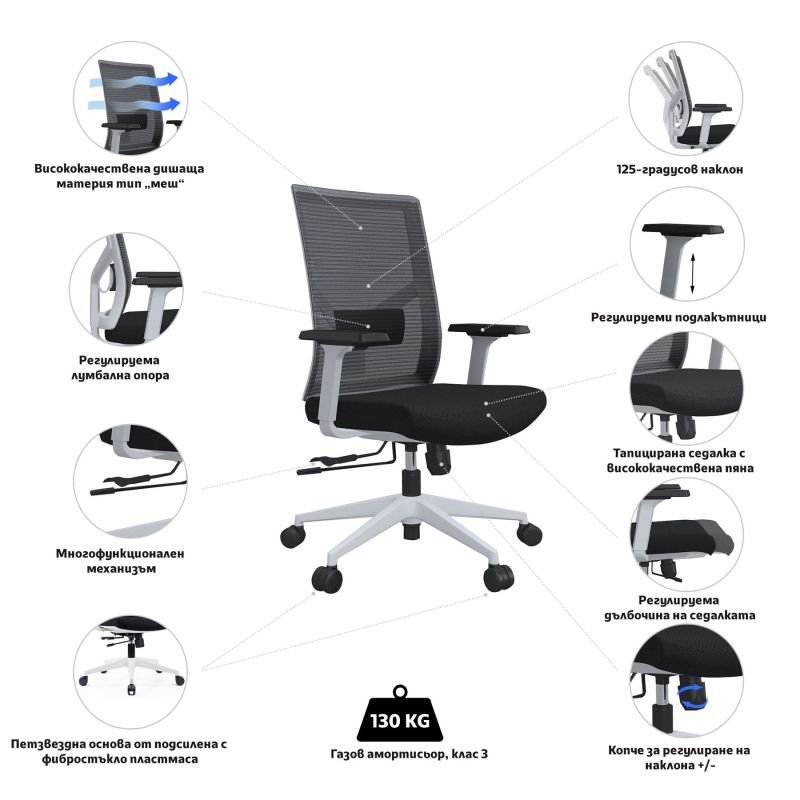 Естествената позиция на седене осигурява опора за бедрата и гръбнака, в следствие на което те стоят свободно и осигуряват свободното циркулиране на кръвта през цялото тяло. Когато искате да релаксирате, просто се отпуснете назад и се отдайте на заслужена почивка! Облегалката е изработена от дишаща материя тип „меш“, която позволява на въздуха да преминава свободно през нея и предотвратява изпотявате и дискомфорт.