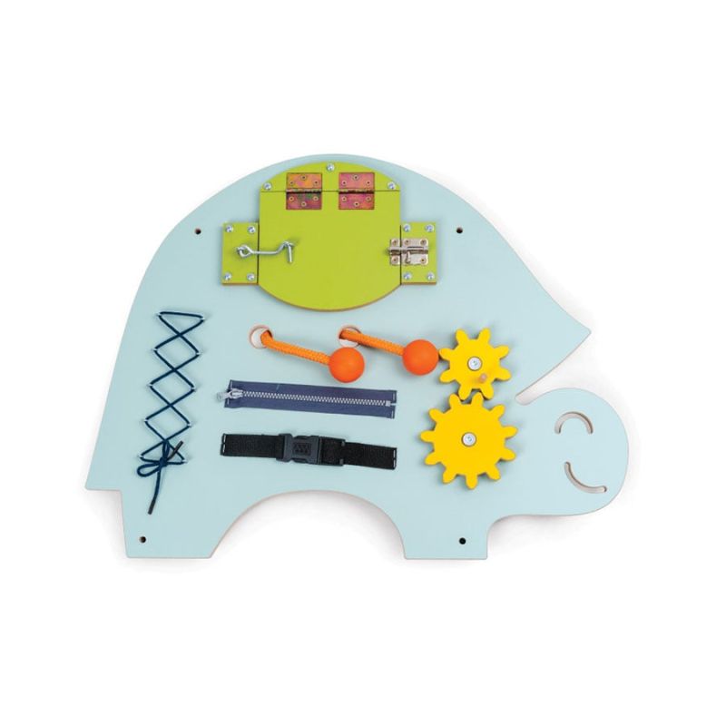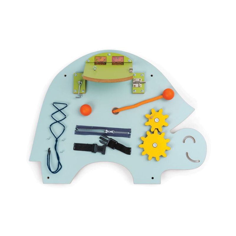 Манипулационна дъска във формата на костенурка със зъбни колела, дървени топки на въже, цип, връзка, катарама за колан и врата с кука и резе.