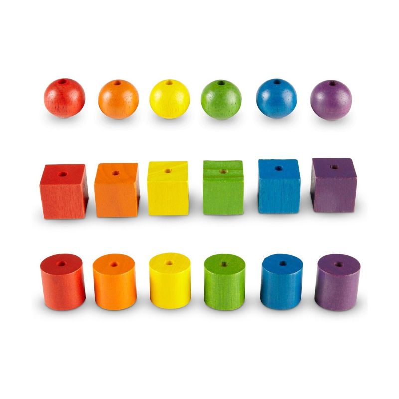 Цветните мъниста за нанизване под формата на сфери, кубчета и цилиндри от дърво, осигуряват ранното усвояване на геометричните фигури. Комплектът включва 20 карти за активност, 108 мъниста, две черни въженца – 92 cm с пластмасови накрайници – 2.5 cm.