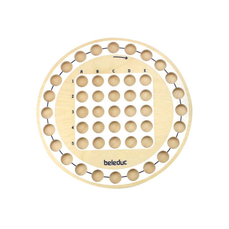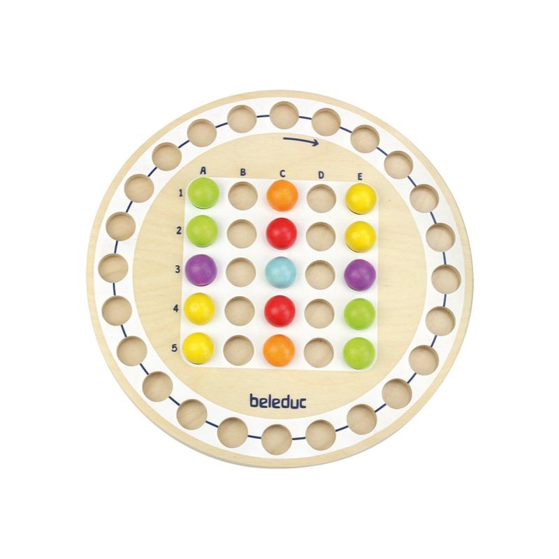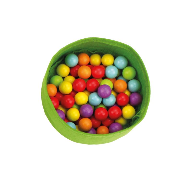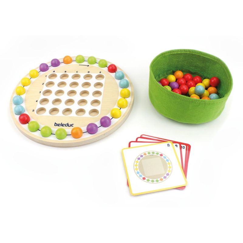 Комплектът съдържа карти с шаблони, 64 топчета и кошничка.