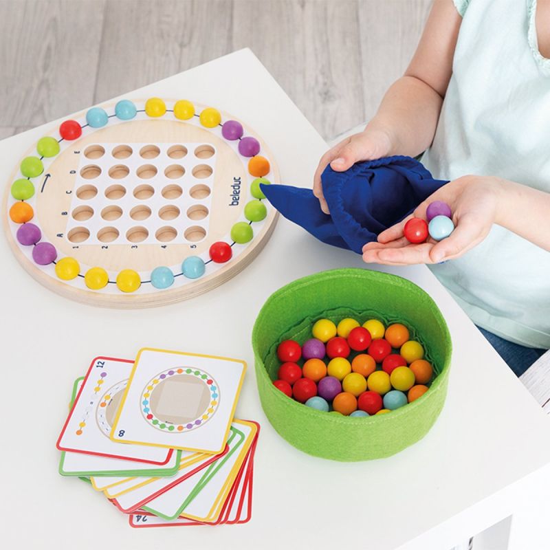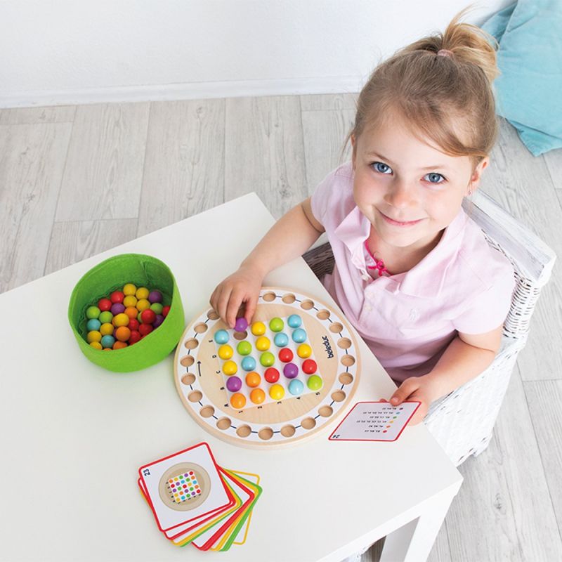 Децата подреждат цветните топчета върху дъската, като се опитват да повторят зададен модел.
