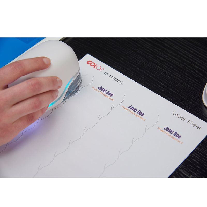 COLOP E-MARK е електронно мобилно маркиращо устройство за създаване и промяна на вашите отпечатъци, чрез използване на приложение от мобилно устройство или компютър. Отпечатва само с едно леко движение.